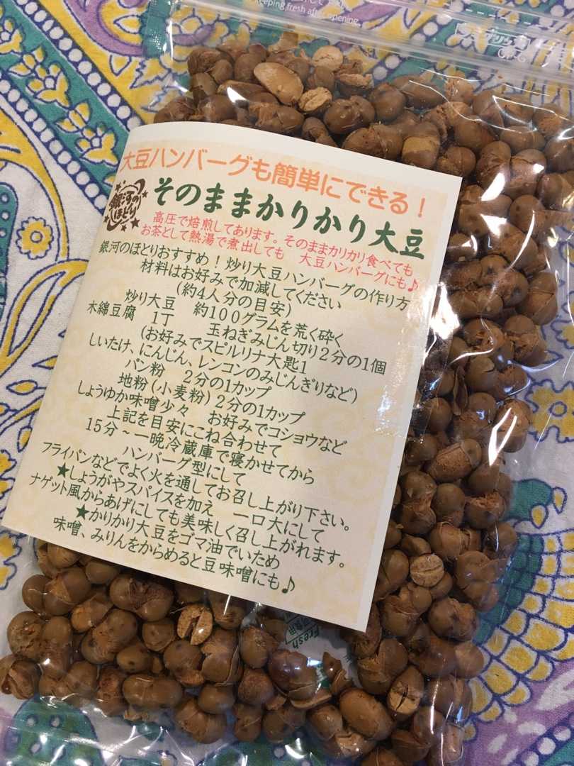 大豆ハンバーグも簡単にできる! そのままかりかり大豆 100g ¥432 (軟らかく煮たお豆でもできます! 水分が多い場合は、パン粉や、おからパウダーで調整してください) ポン菓子機で高圧で焙煎してあります。そのままカリカリ食べても お茶として熱湯で煮出しても 大豆ハンバーグにも♪ 炒り大豆 約100グラムを荒く砕く 木綿豆腐 1丁 玉ねぎみじん切り2分の1個 (お好みでスピルリナ大匙1 しいたけ、にんじん、レンコンのみじんぎりなど) パン粉 2分の1カップ 地粉(小麦粉)2分の1カップ しょうゆか味噌少々 お好みでコショウなど 上記を目安にこね合わせて 15分~一晩冷蔵庫で寝かせてから ハンバーグ型にして フライパンなどでよく火を通してお召し上がり下さい。 ★しょうがやスパイスを加え 一口大にして ナゲット風からあげにしても美味しく召し上がれます。 ★かりかり大豆をゴマ油でいため 味噌、みりんをからめると豆味噌にも♪ どうぞご活用くださいませ。