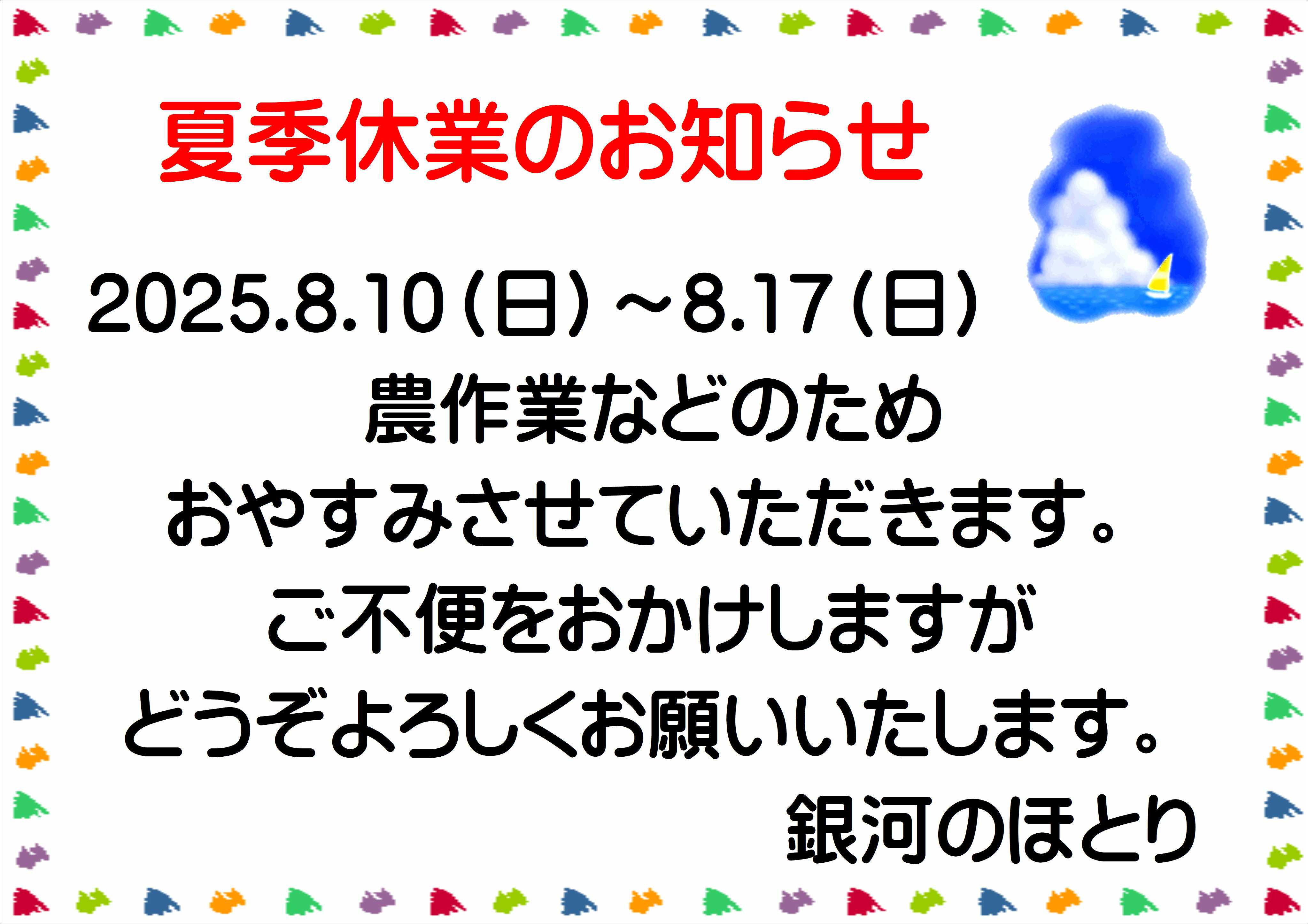 銀河のほとりをいつもありがとうございます。今年も農作業などのため お盆前後夏季休業させていただきます。食材のお買い物は、どうぞお早めに。ご不便をおかけしますが どうぞよろしくお願いいたします。