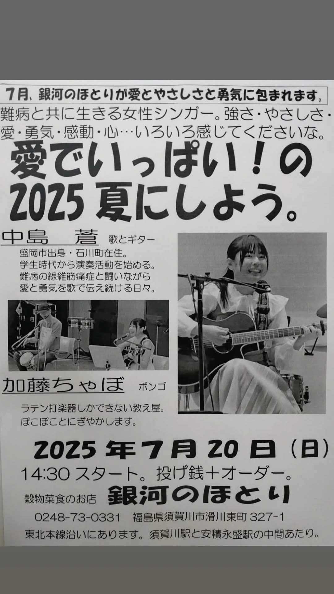 銀河のほとりをいつもありがとうございます!お昼は両日とも平常営業してます。11:30〜14:00明日7月20日(日)はラテンパーカッションの加藤ちゃぼさんと中島 蒼さんの投げ銭ライブ♪明後日7月21日(月)は、瀬戸内海の祝島からこだままことさんと地元の美風さんの投げ銭ライブです。どちらも14:30〜投げ銭ですのでお気軽にお越しくださいませ。※銀河のほとりでお出ししているひじきはこだままことさんのもの♪こだままこと広島県生まれ。20代を東京で過ごすなかで現代の食の在り方に疑問を持ち、天然の海藻がふんだんに生育する山口県上関町の離島、祝島にて海藻の収穫・加工・販売を始める。環境に負荷をかけない暮らしを中心に、島暮らし体験やイベント企画など島の魅力を伝える様々な活動に取り組んでいる。海藻研究の傍ら音楽を愛するベーシスト、シンガーソングライターでもある。https://prema.binchoutan.com/r-natural/toku/toku_vol197.html原発のいらない世界を率先して生きる こだまや 店主 児玉 誠 氏 インタビュー – プレマのニュースレター らくなちゅらる通信WEB明日は、投票日! 銀河のほとりは、 今回もセンキョ割参加してます! 今回の選挙で投票したことを お会計時にお知らせいただくと ご飲食代から200円お引きします! (2025.7.20〜8.10) 先日、文化センターなどで 選挙広報やチラシ 多めにもらってきました。 お手元にない方は、 どうぞお持ちください。 他にも、持ち込んでくださったものは 政党にこだわらず お預かりしてます。 よく検討して一票を投じてくださいね。 #センキョ割 #参院選2025 #銀河のほとり