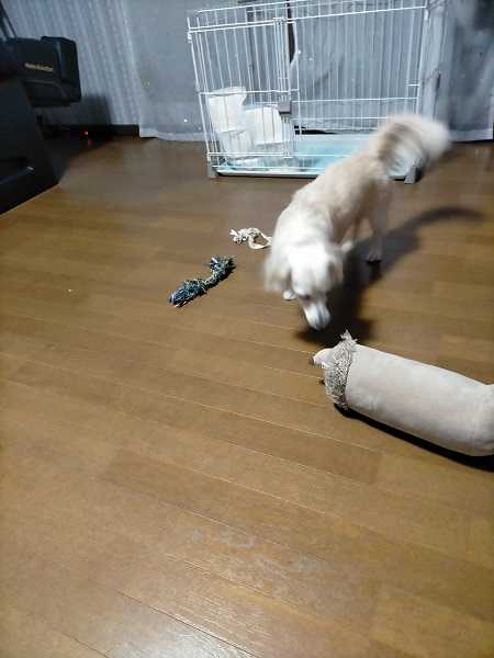 チャロはおもちゃ箱からお気に入りの物を