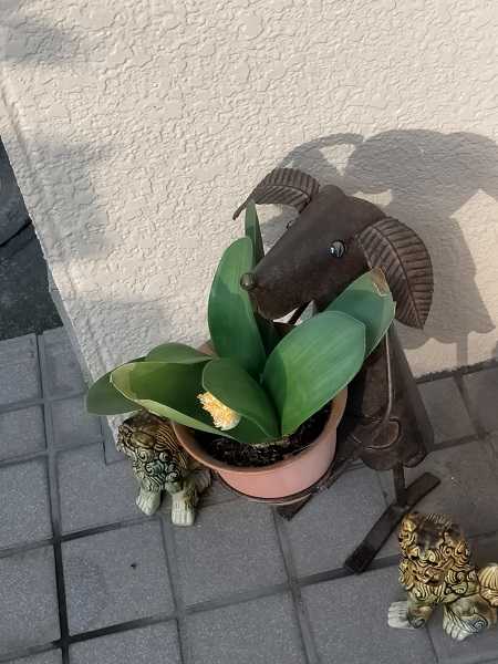 玄関の例のオブジェにお花を置いてみましたが