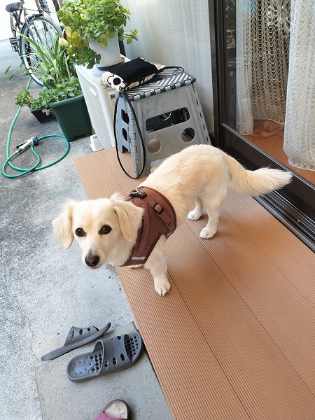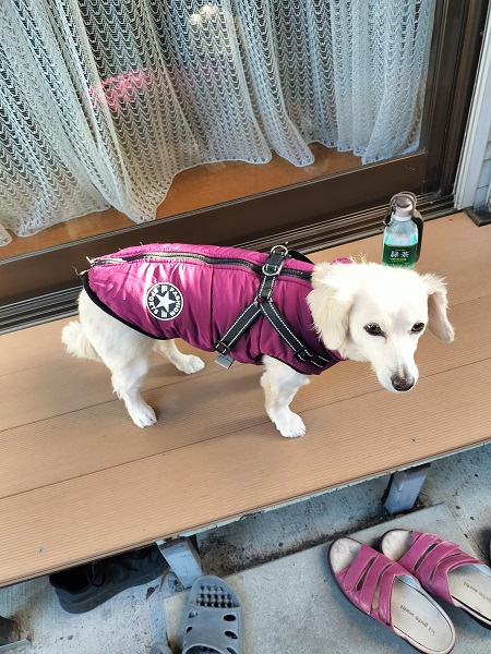 今朝の散歩は寒いかなと思い親心で洋服を