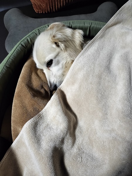ベットで寝てるけど涼しそうなのでタオルをかけて