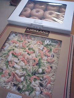 今日は全校遠足です。1年生から6年生まで、往復6キロの道のりを歩きます。んが、予報は昼頃から雨・・・「途中で降らないといいけどね~・・・絶対降るよね~」という感じ。やっぱり昼頃から雨が降り出してしまいました。1年生達、雨の中歩くのはキツイよなあ~実はそのころ母達は・・・ビバ☆コストコ♪しかし私はメイが学校を休んでいたので、今回は行かずに買い物お願いしちゃいました。いつもはその大きさにビビってカートに入れられないようなものを頼んじゃいました。この他にもいくつか頼んだのですが、ドーナツとピザ、大当たり!ドーナツはフワフワですがミスドのよりもモッチリ食べ応えあり。でも疲れて帰ってきたトモはおやつに2つも食べてました。ピザもこれ相当大きい(43×43)のですが1400円!宅配ピザより美味しかったです。上に乗ってる、玉ねぎとピーマンでかすぎじゃね?と思ったのですが、なぜか美味しい。野菜自体も美味しいのか?不思議。6等分してからオーブントースターで焼きました。オーブンより早くて楽ちん。これ一人分。残りは冷凍して私のお昼ごはんに♪メイさんは金曜の夜発熱し、土日は39℃まで上がりました。リンパ腺のところが腫れていたので月曜日に病院に行ったのですが腫れていたのが耳下腺ではなく顎下腺だったのでおたふく風邪ではないとのこと。しかし土日まったく食べてなかったのでフラフラ。体力も落ちてるので遠足は休ませました。さて、雨の中帰ってきたトモさん、帰ってくるなり「今日は絶望の日だった!」(←最近毎日言ってるんですが)やっぱり向こうに着いたら降ってきて、ザーザー降りの中、頑張って歩いたんだって。お疲れ様でした。この全校遠足、毎年あるんだよね~。来年は、晴れるといいね~ガンバレ~