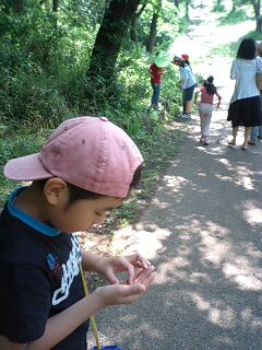 開港記念日で学校がお休みだったので近くの自然公園へ。野いちごや桑の実を取って食べてみよう~というのが目的です。まず見つけたのが、ナガバノモミジイチゴ・・・だったっけ?黄色いラズベリーのよう。ミカンみたいな味がしました。皆はとっくに食べて先に行っているのに、怖くて食べられないトモ。でも、給食で随分成長しました。この木いちごも恐る恐るですが食べてました。一言「おいしくない」と言ってましたが(笑)その後も桑の実や、名前忘れちゃったけど赤い実を取って食べました。緑が多くて、とっても気持ちの良い公園です。