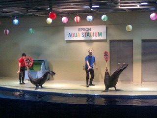 金曜日。「出張で明日帰る」ということでパパさん急きょ帰国。土曜に帰るということは日曜はフリーだな。よしよし。(私パパ)明日、どこに行きたい?(メイトモ)「水族館~」というわけで今回はエプソン品川アクアスタジアムへ。なんで品川には水族館が2つもあるんでしょうねえ~こちらエプソンのは水槽はちんまりしていますが、室内でのイルカやアシカのショーがメインなのかな。アシカのショーはこれまたちんまりしたステージで行われます。イルカのショー私は「人間に調教された動物が芸をする」というのをあまり好まないのですが、ここのイルカとクジラは観客にザッパンザッパン海水をかける(笑)前の列の人たちはそれを覚悟でレインコート来て準備して座っているのですが想像をはるかに上回るかけられっぷり(笑)メガネ吹っ飛ぶんじゃね?ぐらいの。この水族館の見所は「クジラにイヤっていうほど海水をかけられる人間達」なんですね?それならよし。でもイルカやクジラが泳いでるプールの海水かけられるって・・・ やだな夜は近所の美味しい焼肉屋で大満足~な1日でした♪
