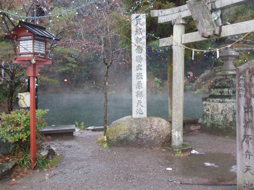 1月7日 晴れ、曇り、雪、雨。風強し1月8日 晴れ6日、何と言うことか。ザンザンぶりの雨の中。東の方に出かけた。最初は、11月に行った栗田美術館の東隣、出原湧水池であります。まあね、ずいぶんと前から地図で見ていつか行くのだと決めていたけど。地図をボーっと眺めていて、いつか行くぞとココロに決めている。すぐ実行されることもあるし、何十年とたってからのことも、、前世は河童ということになっている私は、水のあるところに弱い。名水百選。ここの池は、石灰岩の山から湧き出している水だとかで澄んできれいなようだが、年間を通しての水温が17℃だとかでもうもうと水蒸気が上がり、よく見えないのですよ。。どこから湧いているのか?山の上の方には弁天様がまつられている赤い建物が見えるが、省略。雨と水蒸気の中、池の周りの木に引っかけられたイルミネーションが一人で明滅していた。