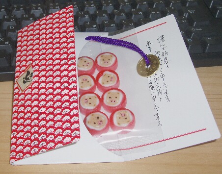 1月15日 晴れ 気温9・0℃ 湿度42%昨日夕方。木工のHさんの個展に。相変わらず端正な作品。お若いけど、キャリアからするとずーっと先輩。赤城山の東麓、廃校になった建物を工房に使っています。ここよりもっと寒い。楽しくおしゃべり。。帰り際にギャラリーの女主人から、お年賀いただいた。この方もステキな方。ファンです。小さなギャラリーですけど、お客様がお見えになるって、オーナーの人柄やキャラクターも大きな要素だなって。じゃあ、駄目じゃん。私じゃ。。ブタの顔の飴。年明けに朝日新聞(新聞、土日版とTV欄しか読まないの、キャッ)に、中国、韓国では今年はブタ年。ブタはお金に縁があるとかで、今年は両国では出産ラッシュになりそう、ってさ。十二支が伝わった頃、日本にはブタがいなかったのでイノシシが代打に立ったとか。それ以来日本では、イノシシ。春もハヨからブタの飴いただいで、五円もついてて、今年はお金がザックザク。って、イメージするのが札ではなく、硬貨だってところが身にあってる?