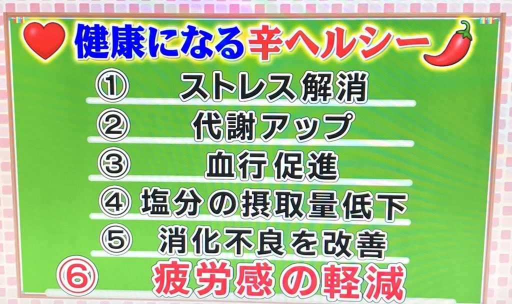 今回世界一受けたい授業で辛い物を健康になる方法を学びました。 辛い物を一緒に食べるとよい食べ物はブルーベリーです。一緒に食べると辛い物が抑えられます。 唐辛子の種が辛いと感じますが、隔壁のところが辛いです。 七味唐辛子は風邪の予防になります。江戸時代は風邪を引いたときに七味唐辛子を食べることがあったそうです。 他には塩分の摂取量が日本人は1日に9g取っています。塩分の摂取量は1日7gです。辛い物を食べることで塩分の摂取量が減ることができます。 辛い物を食べ過ぎすとお腹が痛くなる人がいます。私も台湾のホテルで辛い物を無理して食べ過ぎた為お腹が痛くなりました。だから、辛い物は体が温まる程度食べると良いです。
