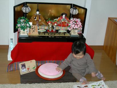 先週は2・3日暖かでしたが、週末にはまた冬型に逆戻りでしたね。昨日はももちゃんの初節句のお祝いに呼ばれました。そして…初誕生のお祝いもいたしました(*^▽^*)パパとママとももちゃんパパのお母さんと弟夫婦と2歳上の従姉妹ママのお父さんとお母さん(Gママ)と妹大人が8人子どもが2人。従姉妹はももちゃんのすることみんなしたがるけれどももちゃんはばぁばに抱かれてきょとんとしてます。大きく口を開けては笑わせて、は~~いの声に手をあげては笑わせてカメラ班・ビデオ班の撮影係りが動き回ってシャッターを切ります。餅踏みは嫌がりもせず、すっとわらじを履いたまま。一目散に目指したものは…筆ペン。その次は電卓。お餅が乗ってる黒い台はパパのお手製です。お雛様の奥の白い柱は上に飾るスペースがあります。他にもいろいろありまして。。。なかなか器用なんですよ。食事の時少し昼寝したけど、ぐずりもせずにおりこうさんでした。ももちゃんのお陰で幸せな楽しい一日でした。ありがとうね(*^▽^*)