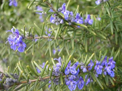山茶花の垣根の外側に植えてます。南西ですから一日中よく陽が当たって・・・花盛りです。良く見ると斑点があって唇のような形してますよね。粒々のようなのが蕾で今からもたくさん咲きます。かなり強い匂いですが爽やかですよ。挿し芽でつきますからももちゃんところにも持って行ってます。家に行くとじいじが直ぐにベランダ覗くんです(笑)葉っぱは肉の臭みを取るのに使います。茎からしごいて来て細かく刻んで肉に混ぜ込みます。枝のままでもいいですよ。横に添えたらお洒落です。Yahoo辞書より*******************************************************ローズマリー【rosemary】 シソ科の小低木。高さ約1メートル。全体に芳香がある。葉は線形で裏面に綿毛があり、対生する。初夏、淡紫色の唇形の花をつける。葉から香油をとり、香水や石鹸(せっけん)などに、また香草として肉料理などに用いる。地中海沿岸地方の原産。迷迭香(まんねんろう)。 [ 大辞泉 提供:JapanKnowledge ]