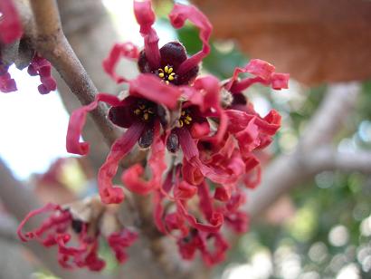 赤花満作です。線状の花びらと書いてありますが。。。珍しいでしょう?幅は3ミリくらいでしょうか?カンナで削った薄い板のようです。満作は黄色だそうですから、これは園芸種でしょうね。春になって真っ先に咲くから、まず咲く⇒満作といわれるそうです。中心の濃い赤で硬いところは「がく」がくから紙を細長く切ったような花びらが4枚ついてます花びらがたくさんある様に見えるのは、がくが3・4個かたまってるからです。がくの中心いは黄色い(めしべかおしべ?)点が7~8個見えます。黄花満作が多いですが、我が家は赤花満作です。2005年の日記から葉は丸くて可愛い形です満作の葉の紅葉はこちらからところで…次女が見てたDVD THE3名様何ともおかしくて…笑っちゃいました。ミッキー、まっつん、ジャンボのフリーター3人が、ひたすら深夜のファミレスでダベる、シチュエーションコメディです。Yahoo辞書より**********************************************まん‐さく【満作】 マンサク科の落葉小高木。山地に生え、2、3月ごろ葉より先に、枝いっぱいに黄色い花が咲く。花びらは線状で4枚ある。葉は菱状円形か倒卵形で互生し、秋に黄葉。庭木にもする。《季 春》「―に滝のねむりのさめにけり/楸邨」 [ 大辞泉 提供:JapanKnowledge ]