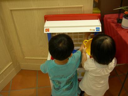 ももちゃんのママに干物を届けた時、ももちゃんのサンダルを見たのですがその横においてあったのが、ドイツのボーネルンドというメーカーのキッチンセンター台の上に、ポリプロピレンで出来たフライパンやおなべが置いてありました。カラフルで大きさが手ごろ。持ちやすくて、丈夫そうです。サンダルを見てるママのとこに、フライパンを持ってきては戻って遊びます。そのうち、少し大きな男の子が来て、ももちゃんにたこ焼き作ってくれました。仲良く並んで遊んでるでしょう。お気に入りのようですから、時々ここに来て遊ばせましょうか(*^▽^*)