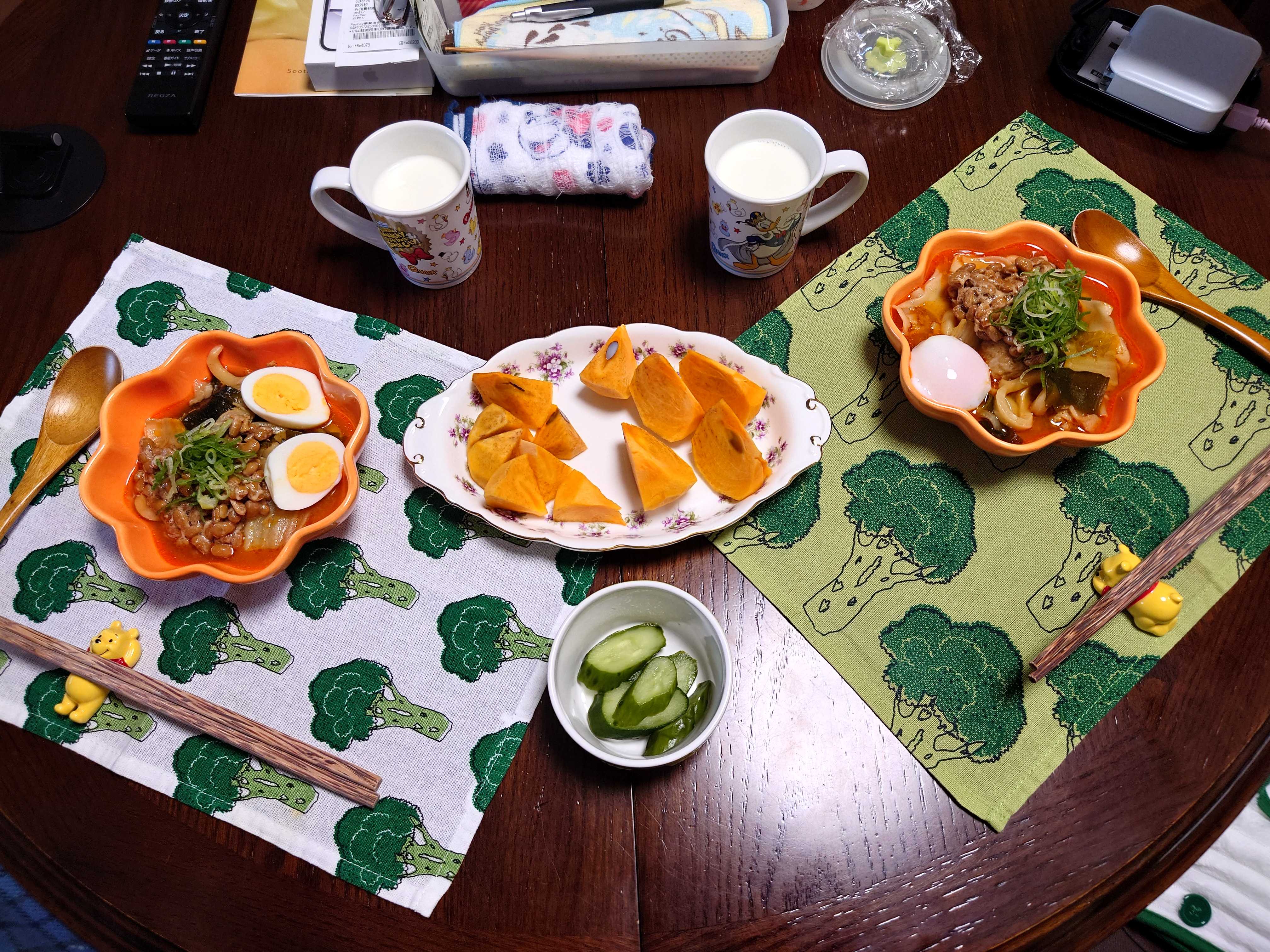 今朝の我が家の朝食は、昨晩の残りの「キムチ鍋」。昨晩の残りのキムチ鍋。納豆、温泉たまご、ワカメ、うどん入り。きゅうりの漬け物。デザートの柿。