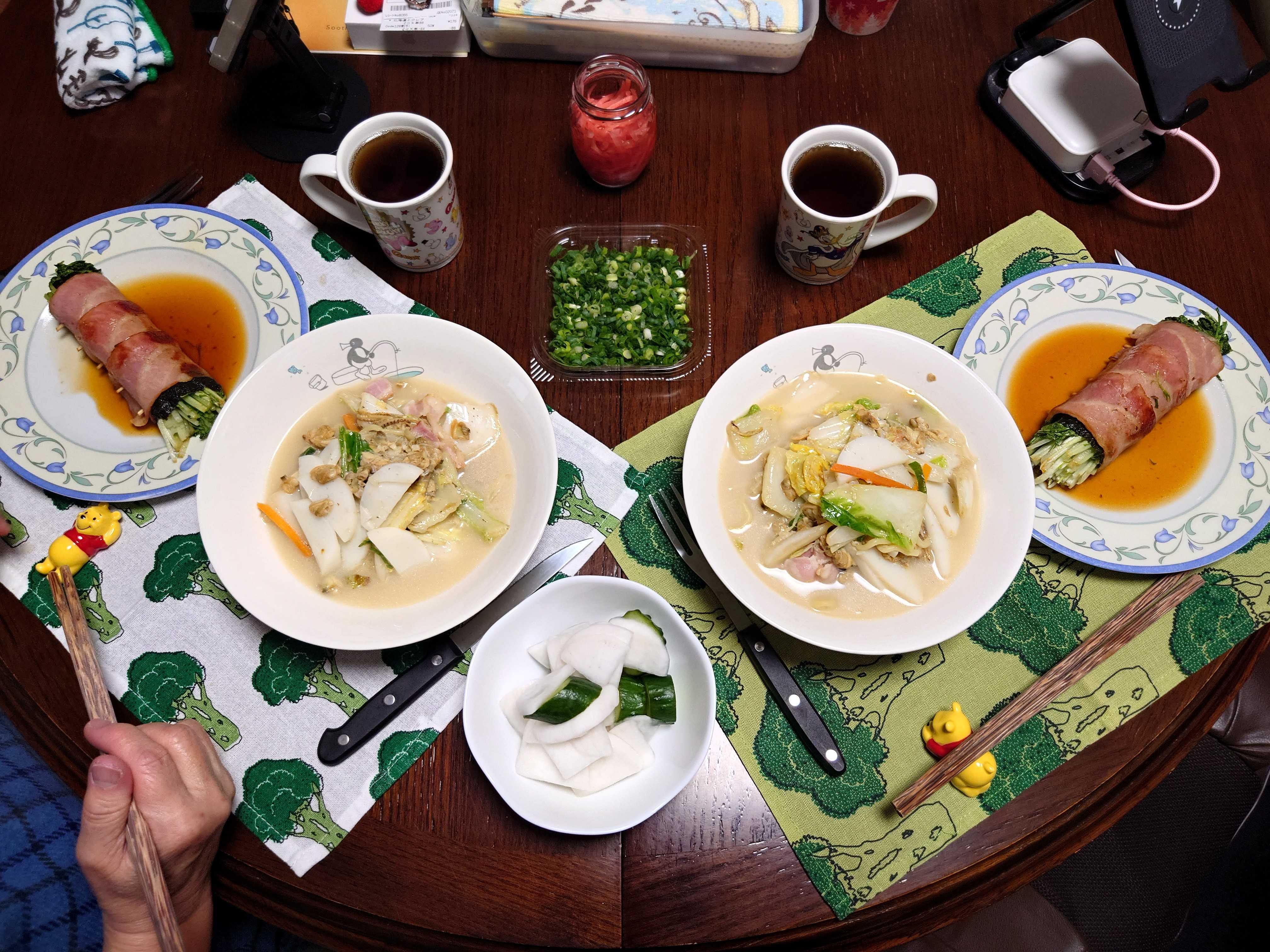 今日の我が家の夕食は、「ちゃんぽん」と「水菜のベーコン巻き」。ちゃんぽん。あさりの水煮、ベビーホタテの水煮、ベーコンも入れて見ました。水菜のベーコン巻き。