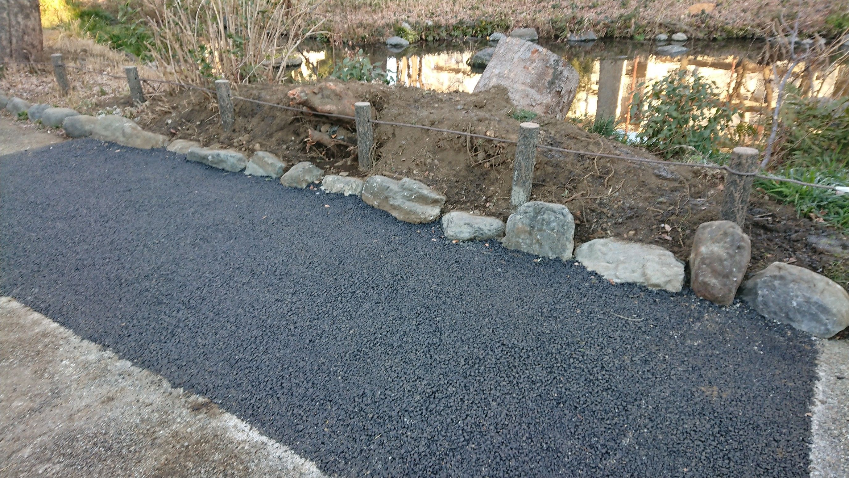 台風の影響で木が倒れ、道路(遊歩道)が陥没したところがようやく補修されました。ただ、根の部分はそのまま残されています。
