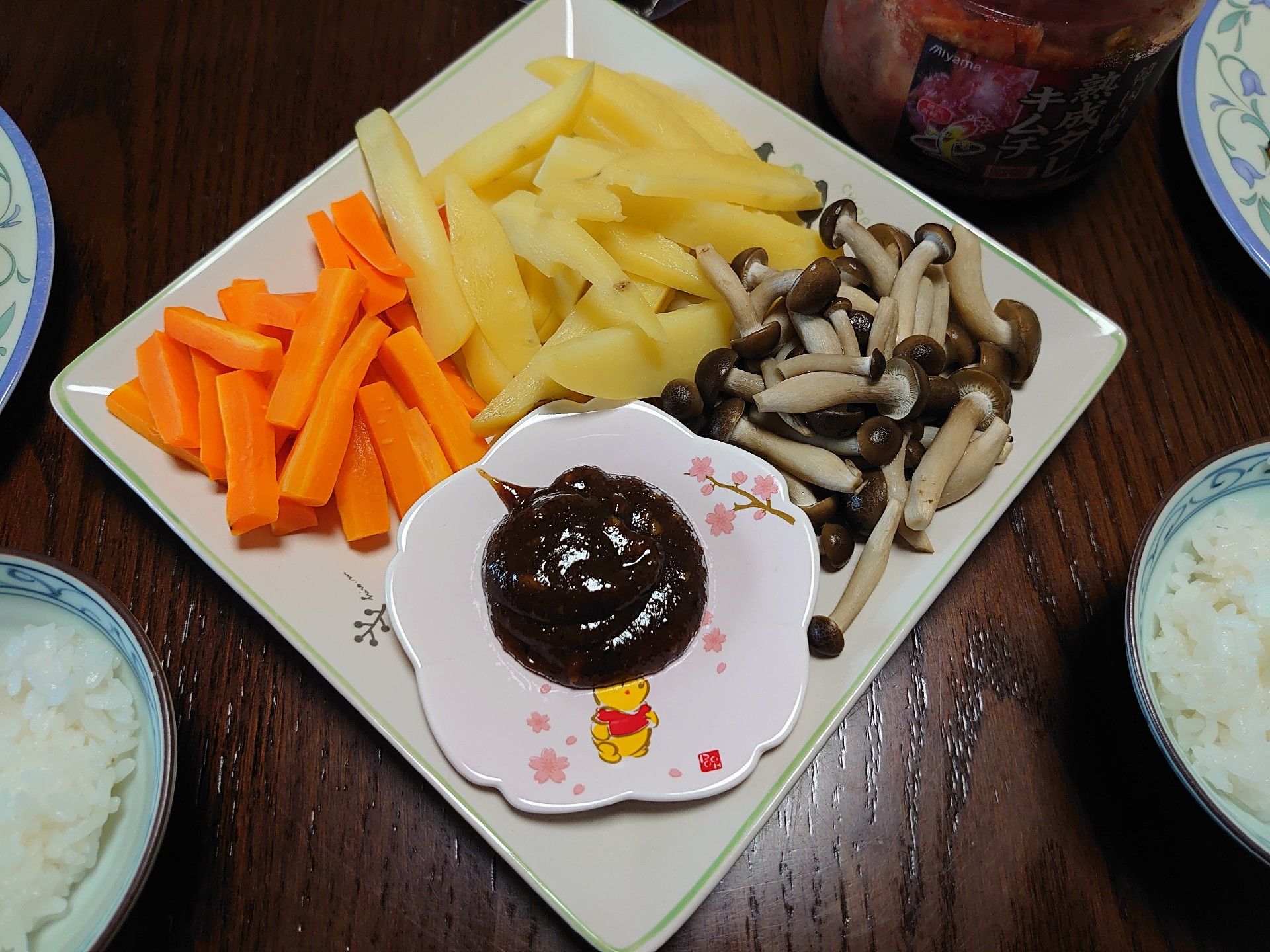 今日の我が家のランチは、鮭の切り身と蒸し野菜をくるみ味噌で。