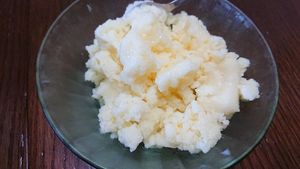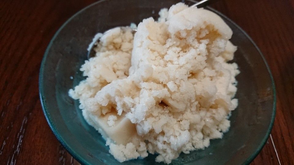 今日の午後のおやつの第2弾。味付き豆乳(マンゴー味といちご味)を凍らせたものをおろし器でおろしてみました。