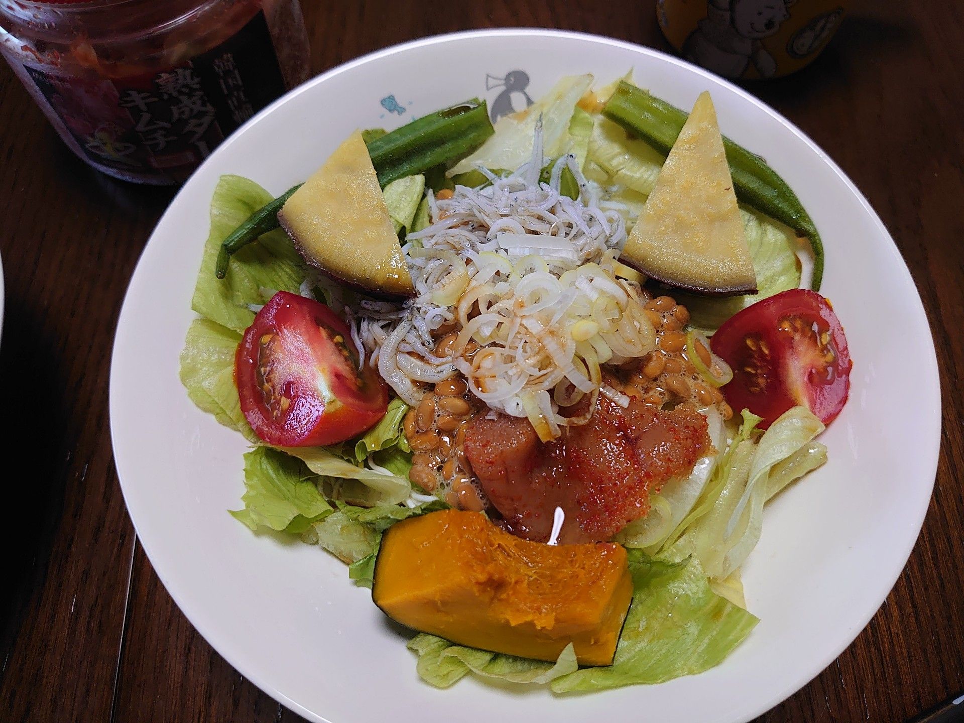 今朝の我が家の朝食は、豆腐そうめんのしらす納豆キムチ載せ。