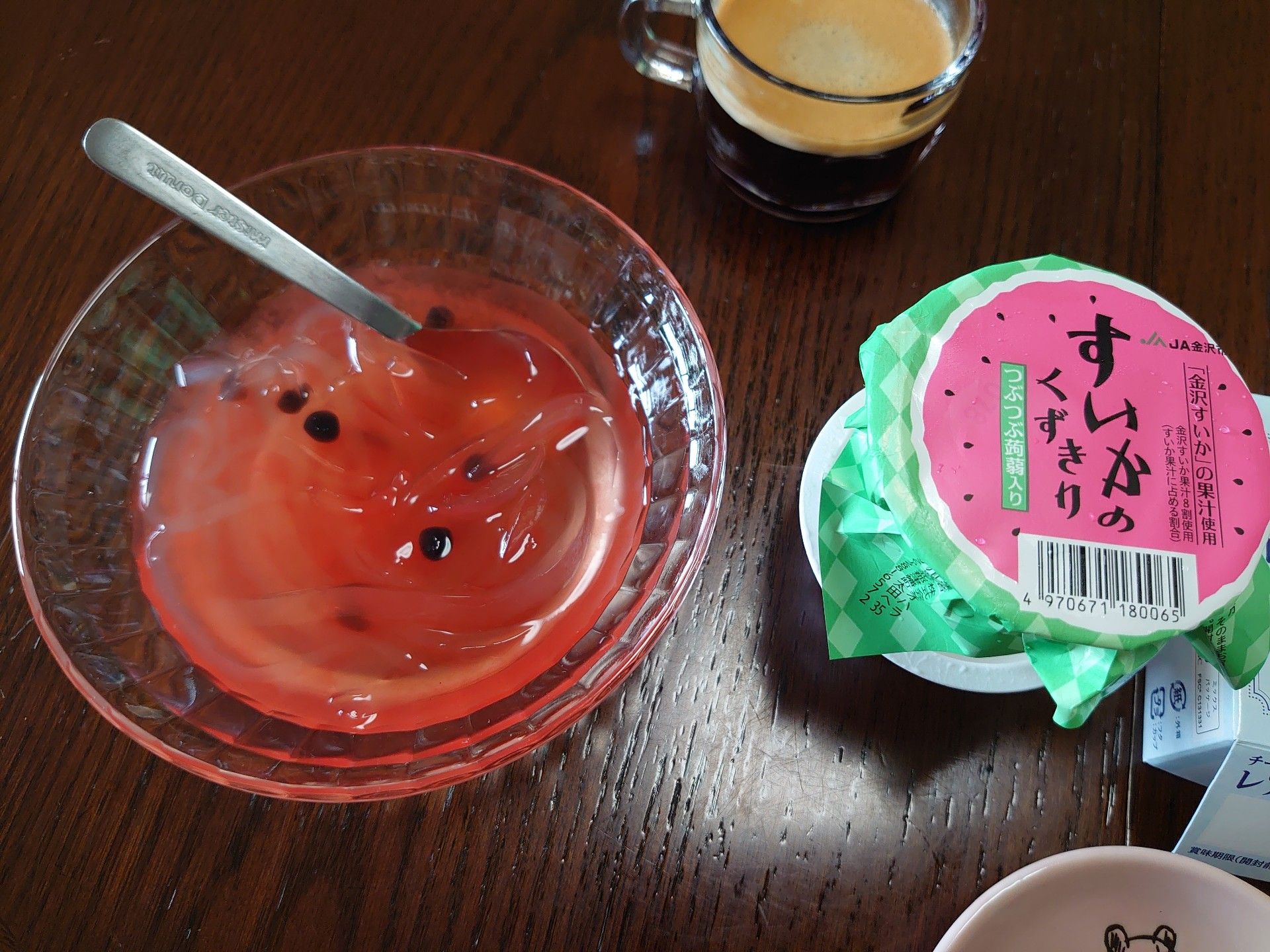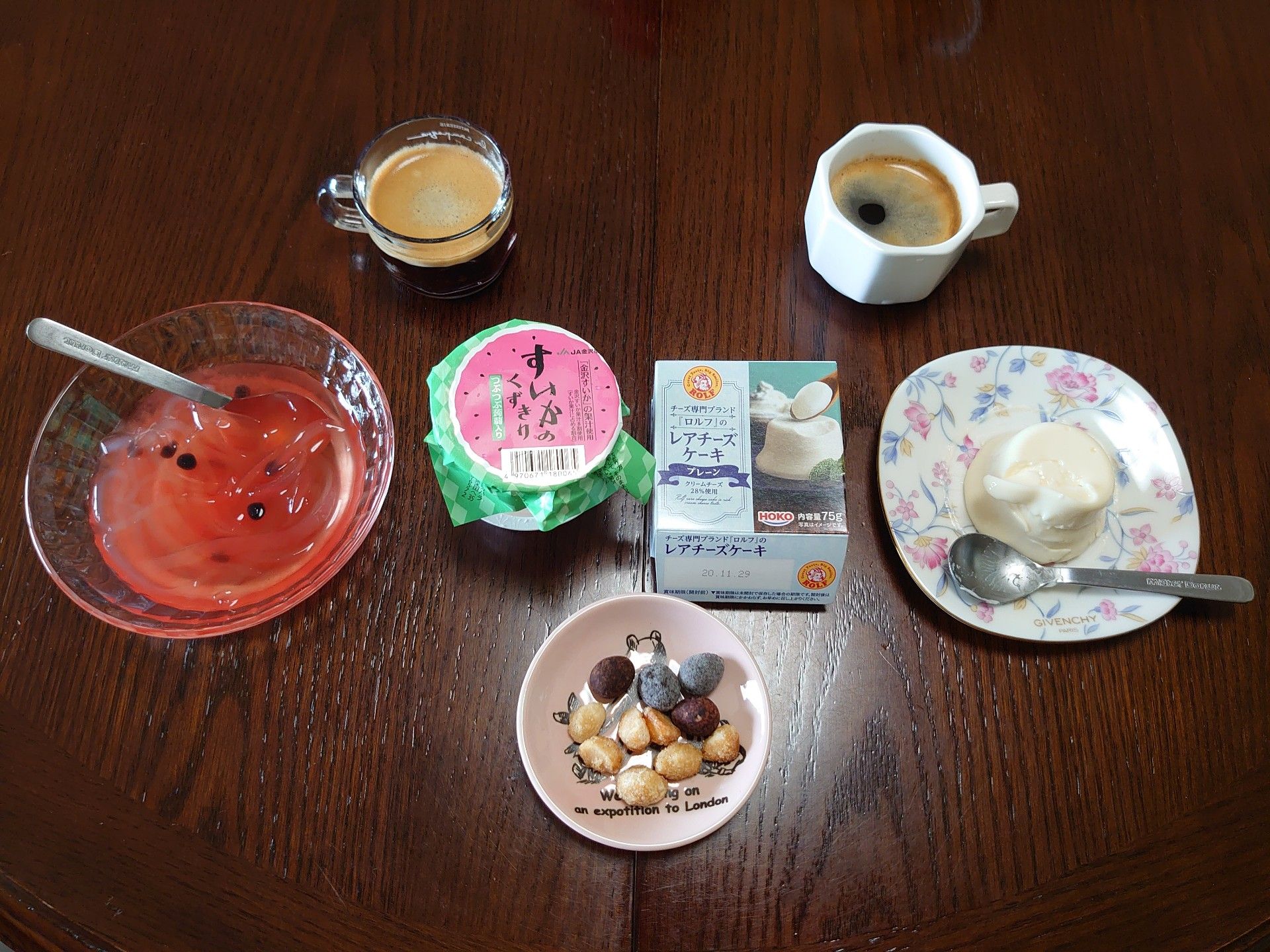 今日の午後のおやつは、「スイカのくずきり」と「レアチーズケーキ」とネスプレッソで淹れたコーヒー。