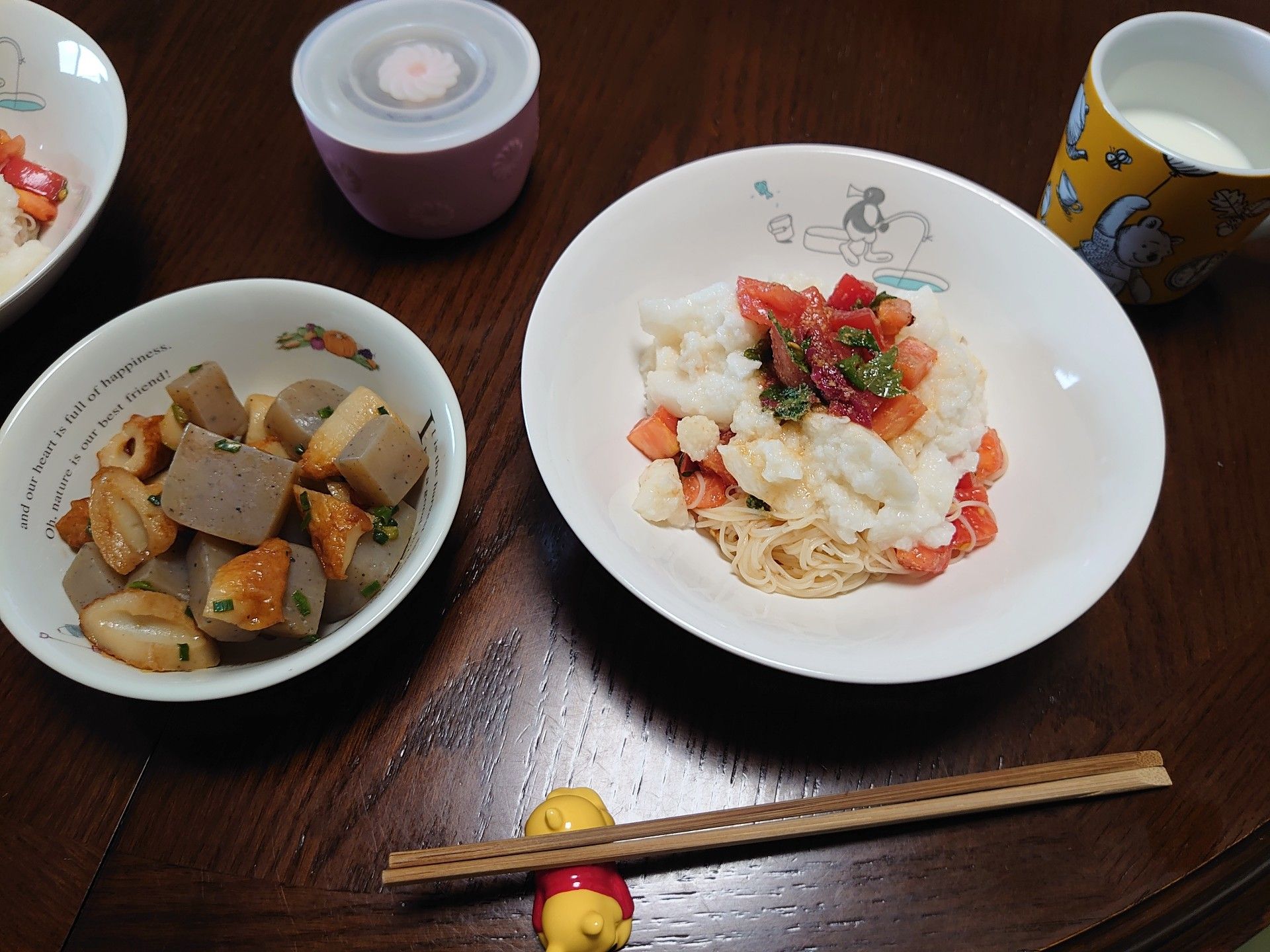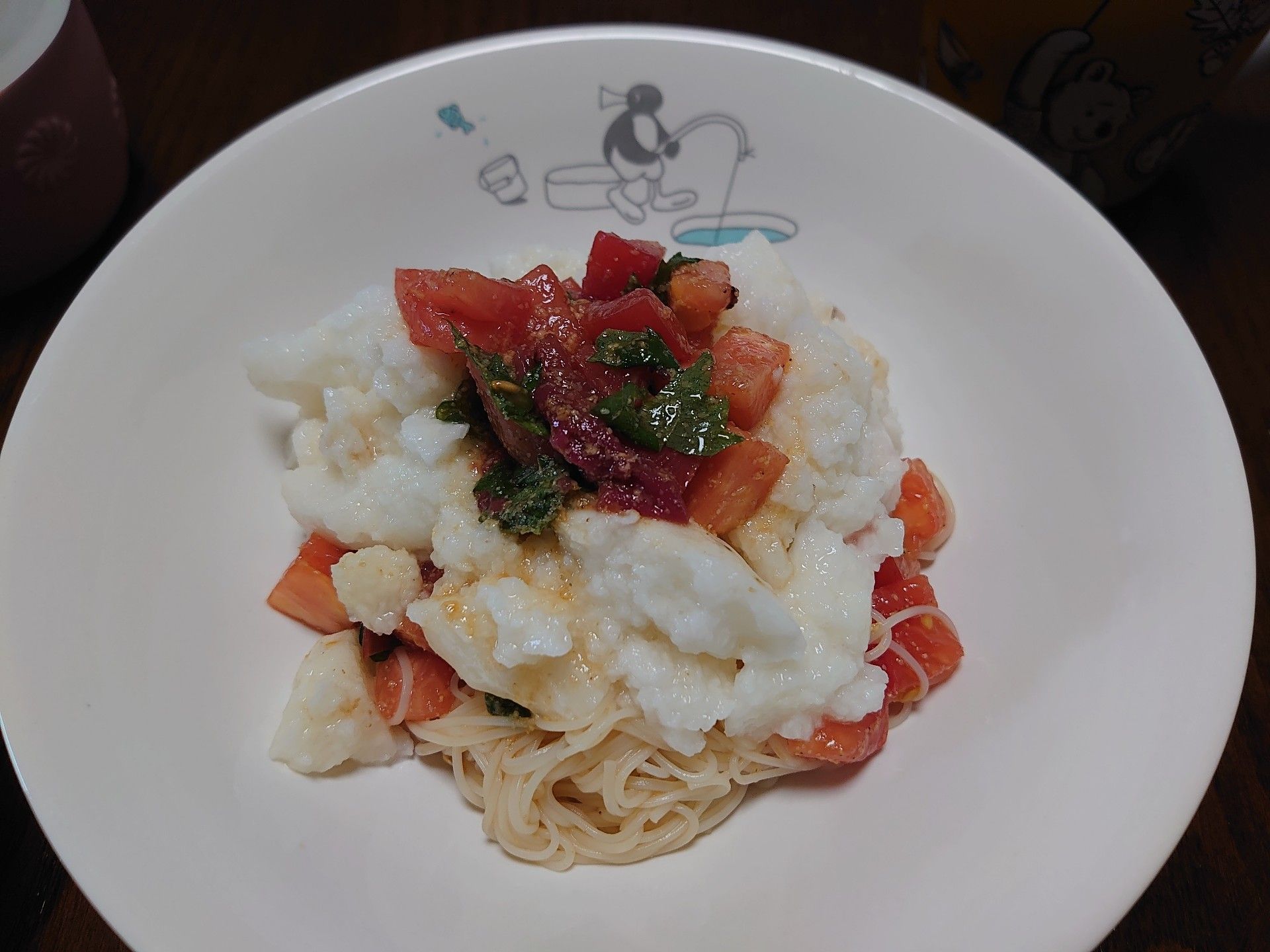 今日の我が家のランチは、トマトと叩き長芋のそうめん。