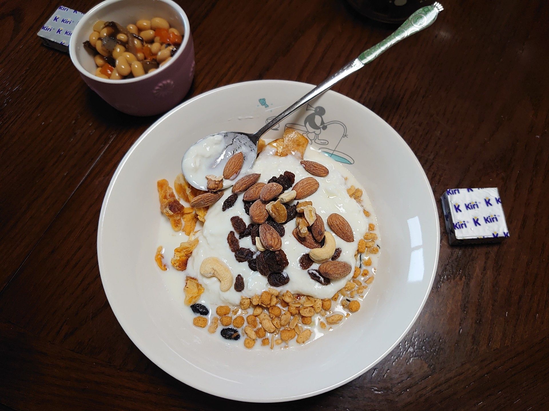 今日の我が家の夕飯は、ナッツ・ドライみかん・レーズン・バナナチップ入りのシリアルヨーグルト。