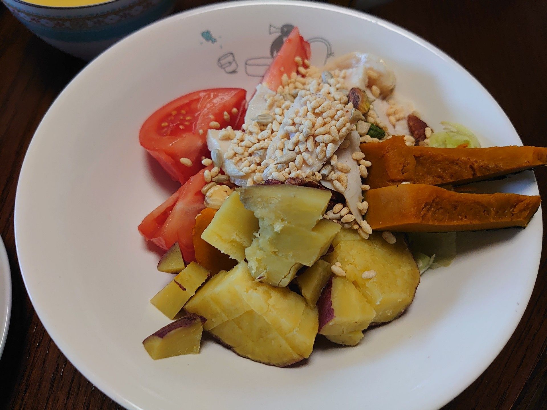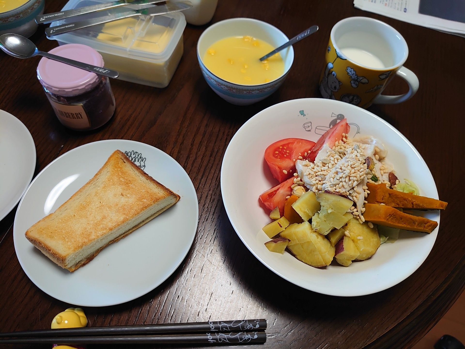 今朝の我が家の朝食は、トマトと蒸し野菜のサラダとトーストとコーンスープ。
