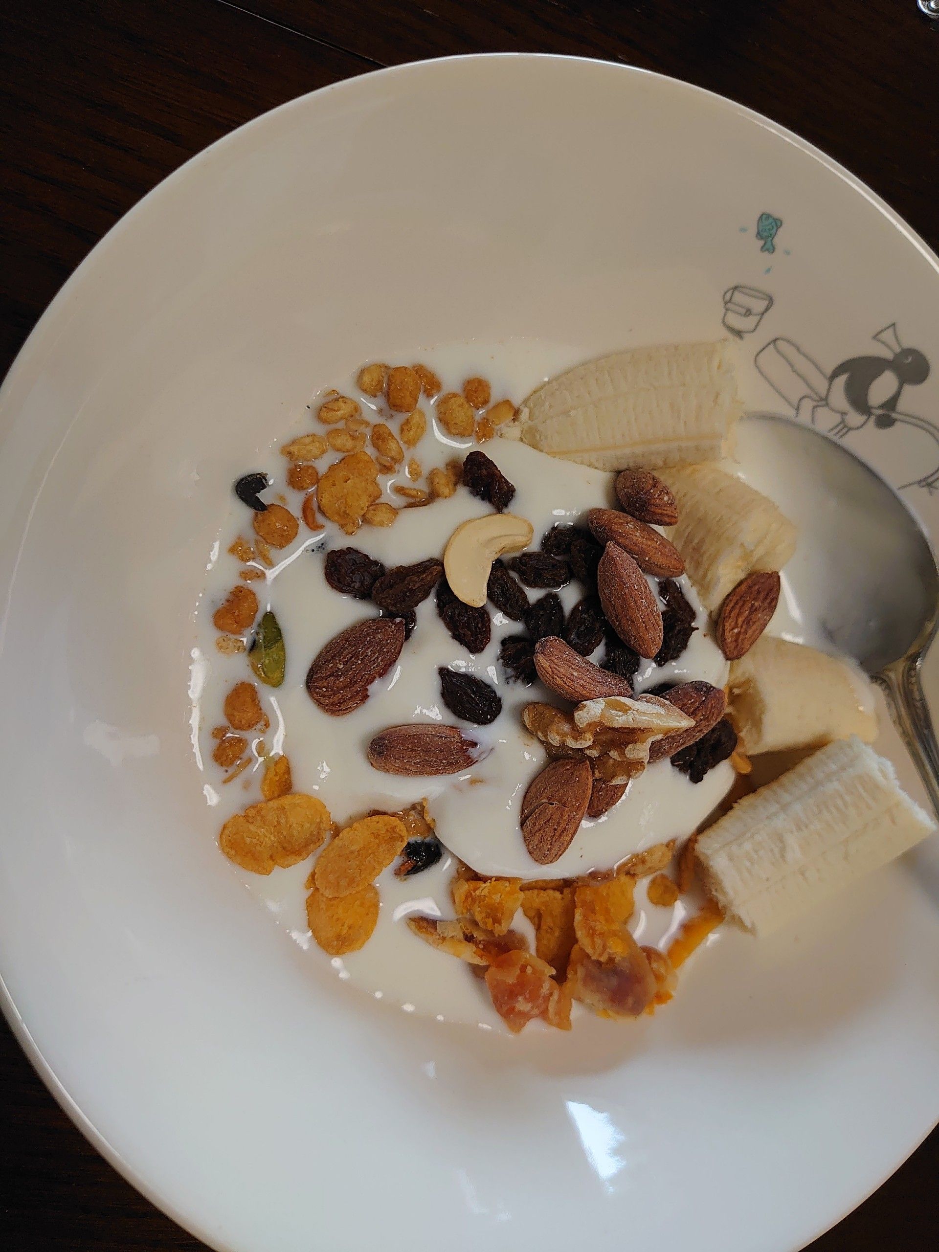 今日の我が家の夕飯は、バナナ・ナッツ・ドライみかん・レーズン入りのシリアルヨーグルト。