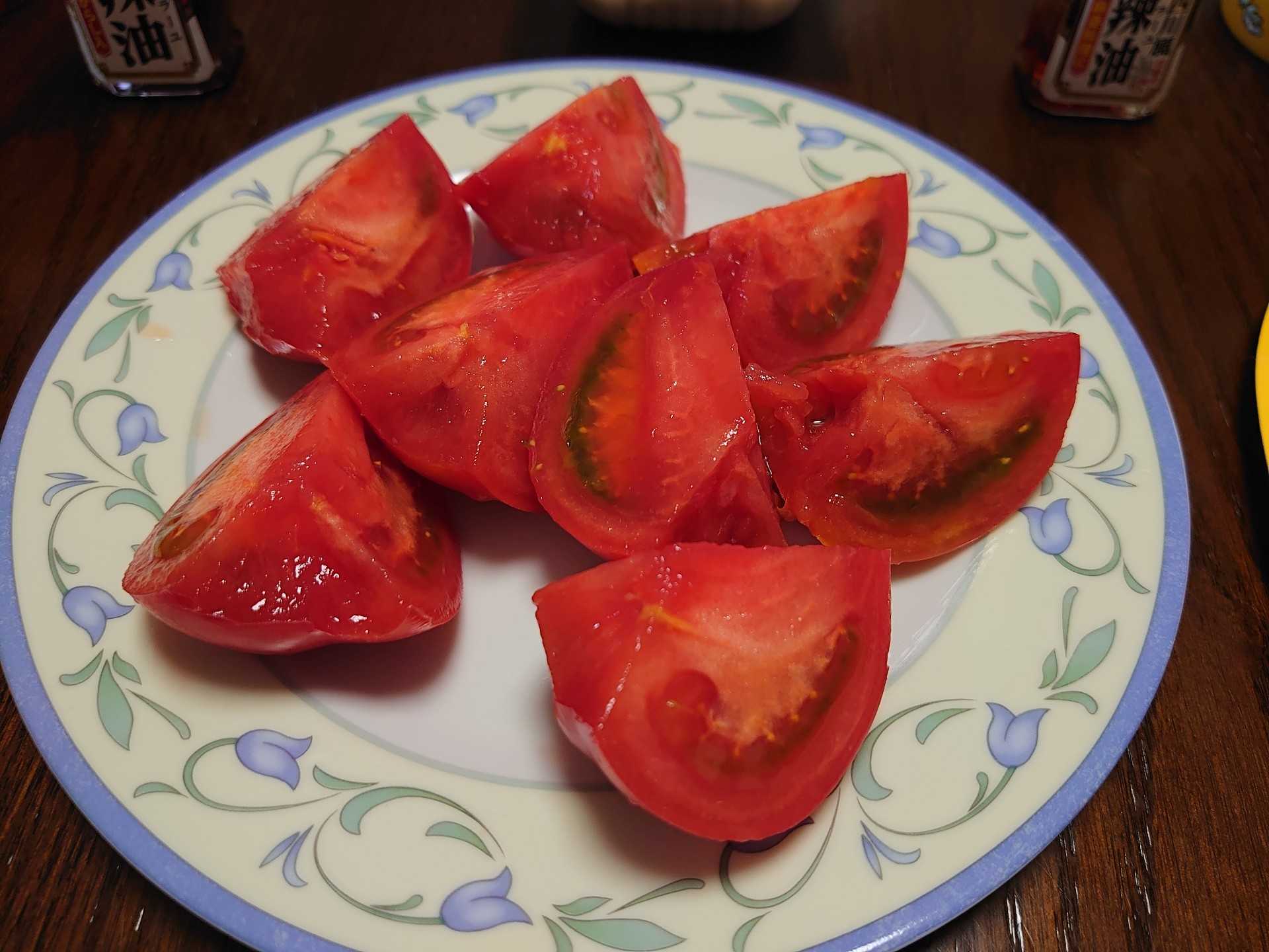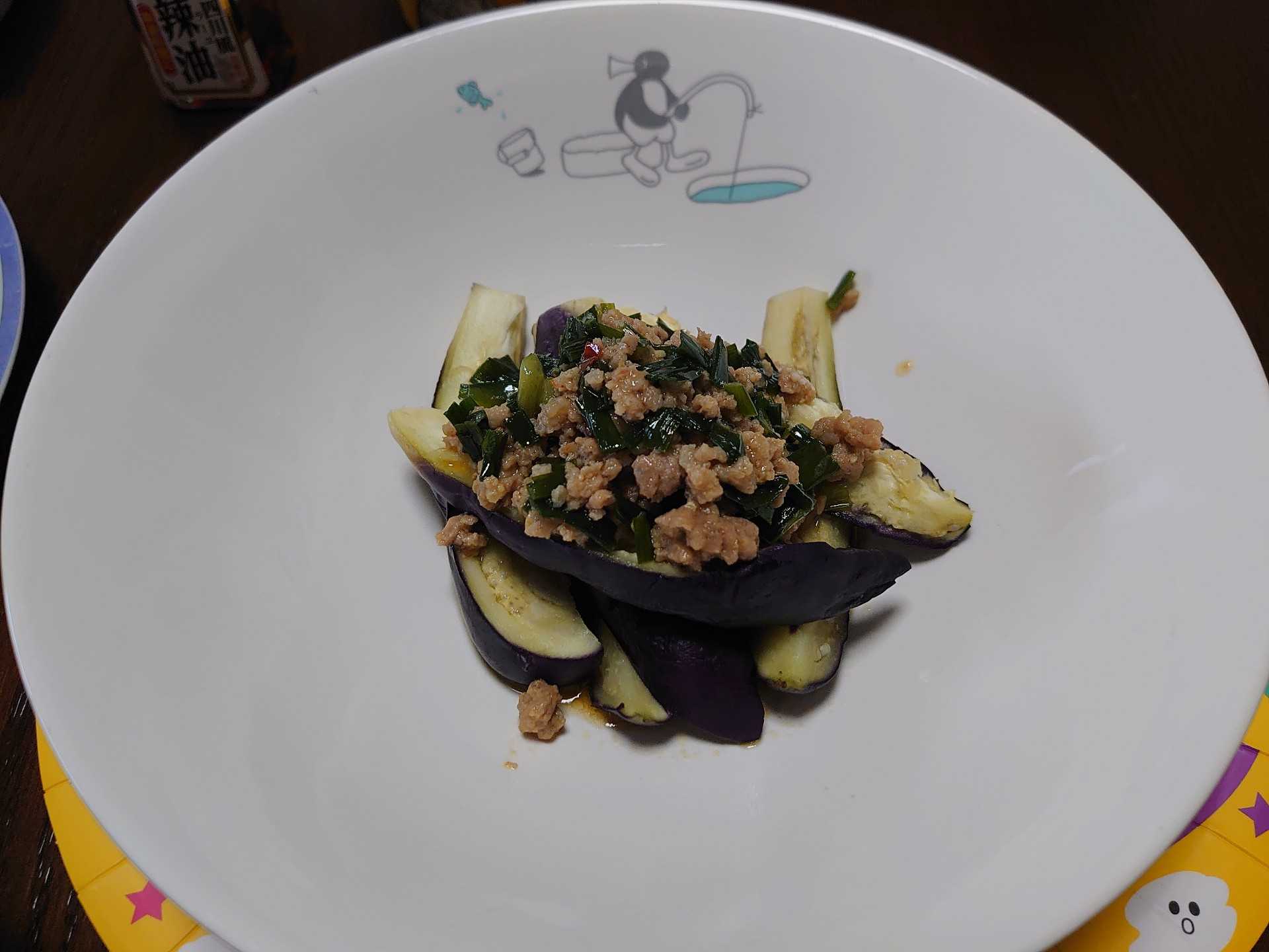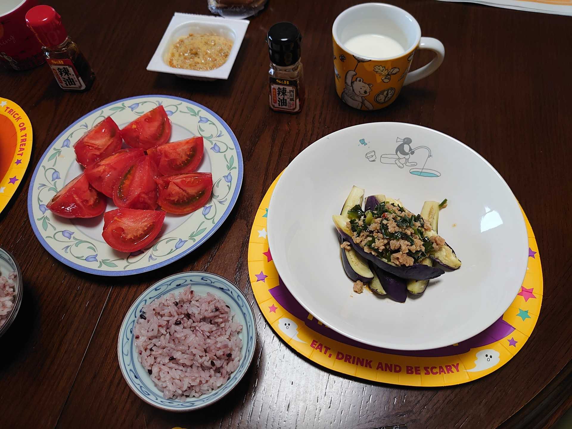 今日の我が家のランチは、蒸し茄子の肉味噌そぼろあんかけとトマト。