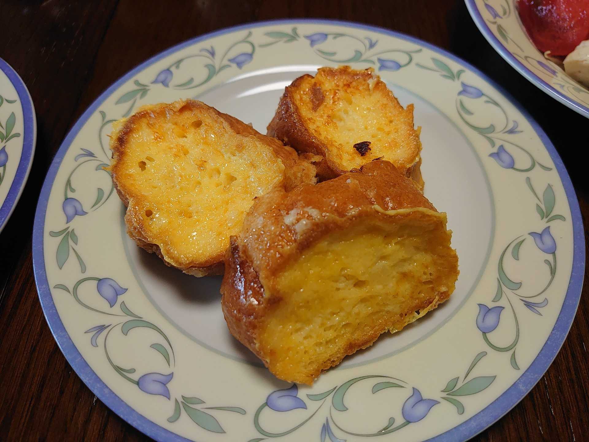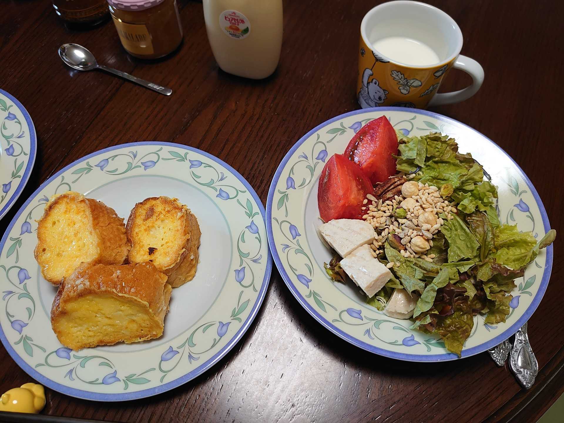 今朝の我が家の朝食は、フレンチトーストとサラダ 。
