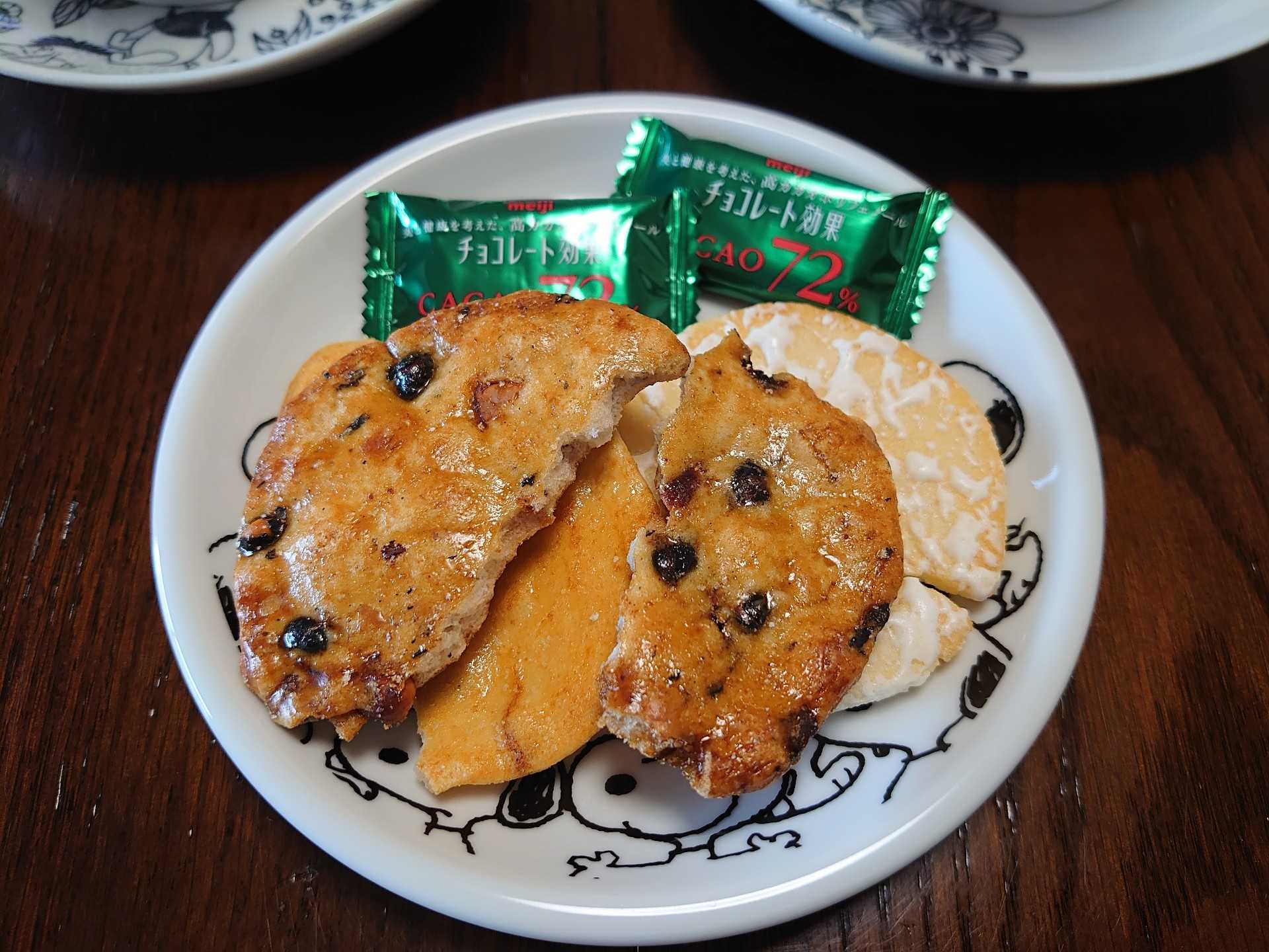 今日の午前中のおやつは、チョコレート効果とせんべいと豆から淹れたコーヒー(「無印良品」の「オリジナルブレンド」)。