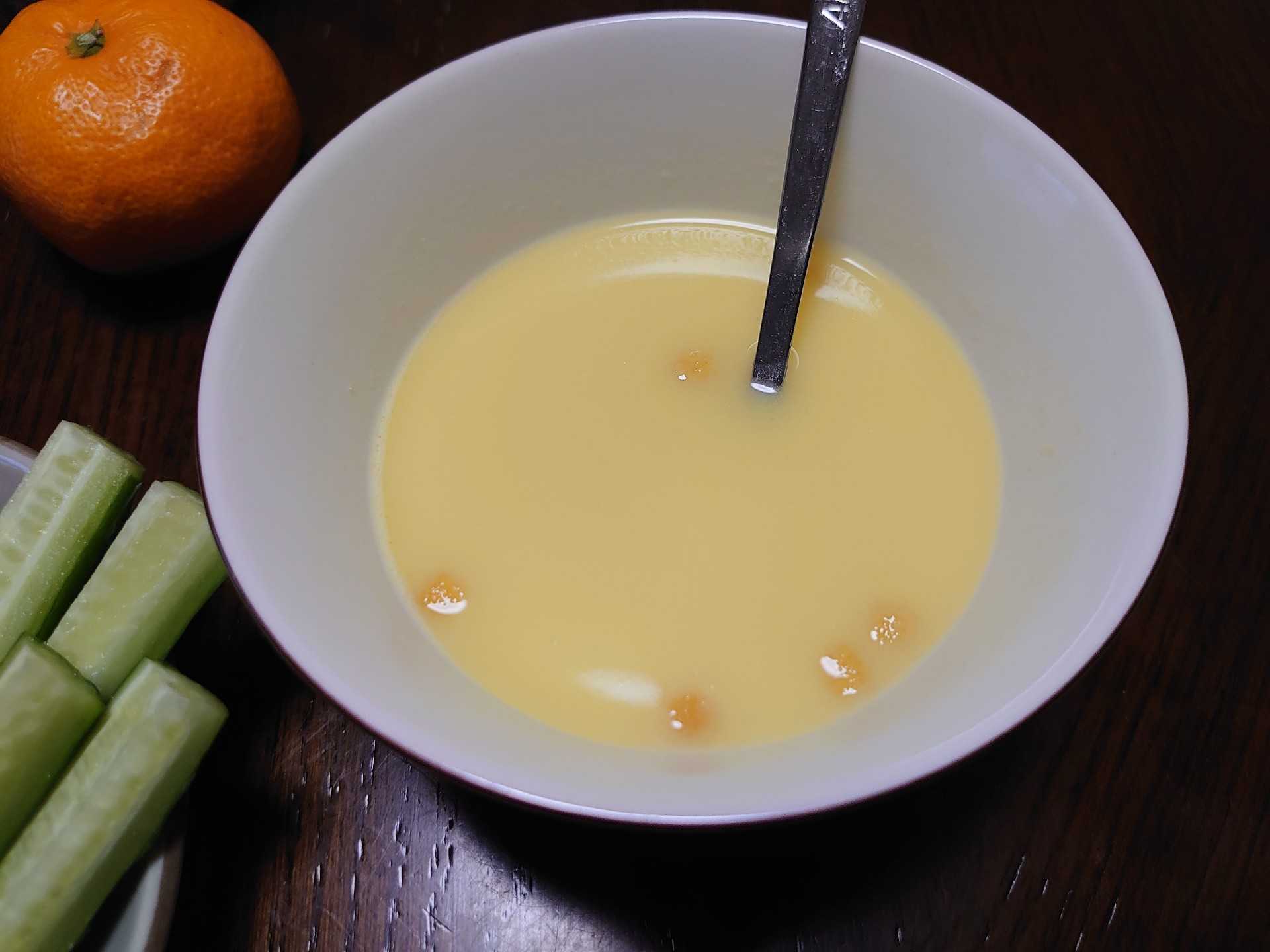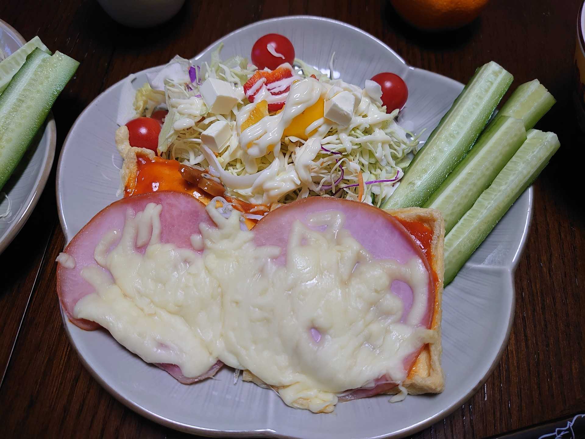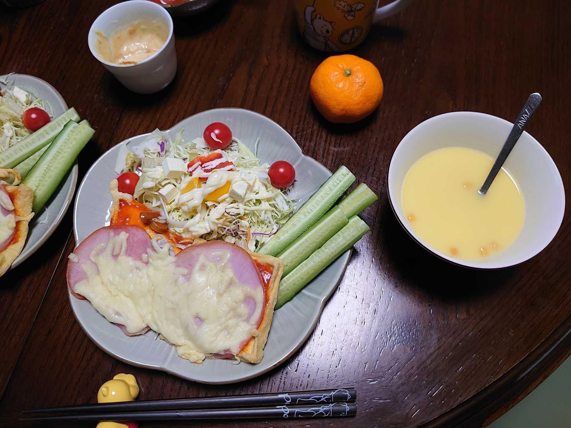 今朝の我が家の朝食は、厚揚げのチーズ焼きとコーンクリームスープ。デザートは、みかん。