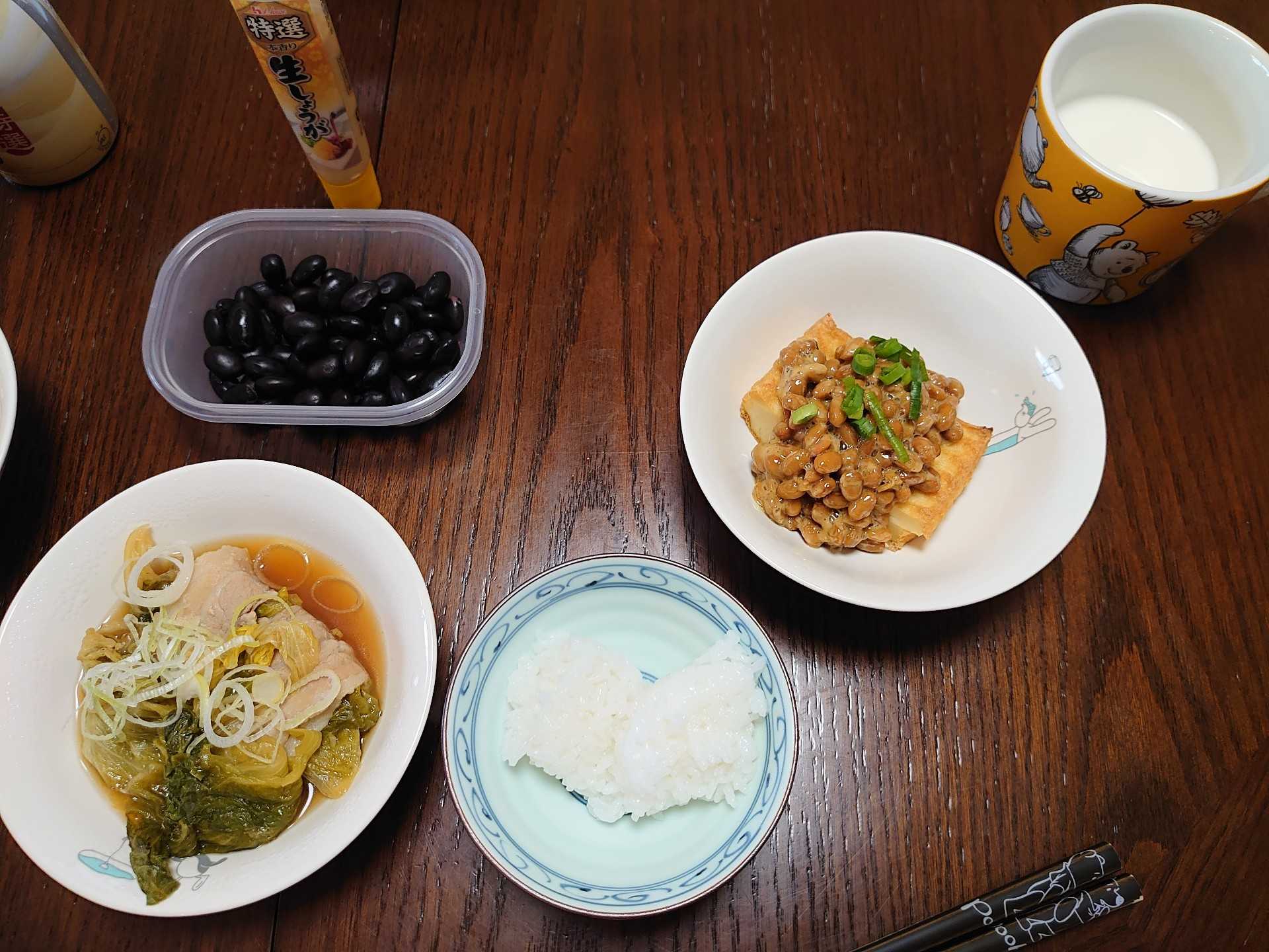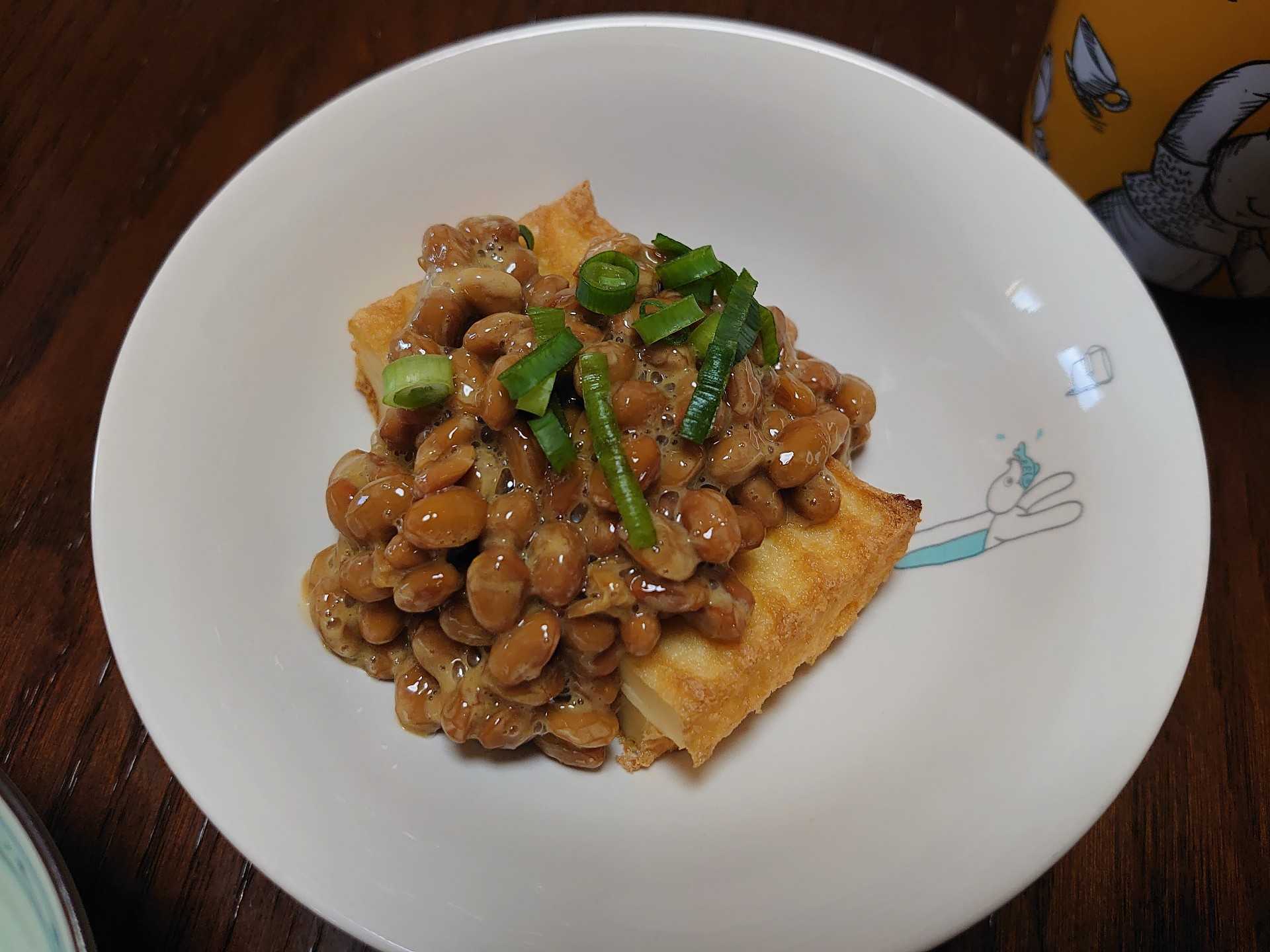 今日の我が家の夕飯は、厚揚げの納豆載せ。