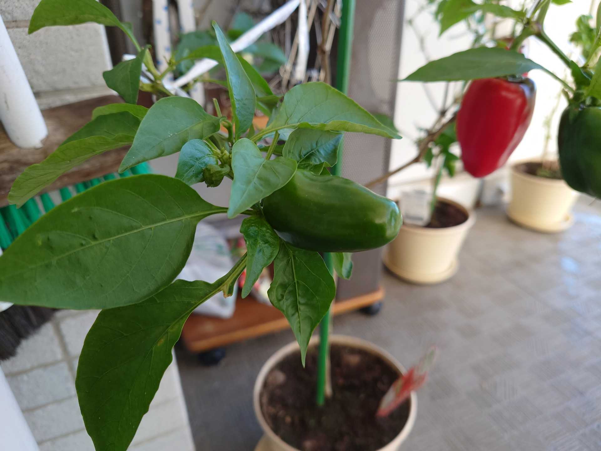 赤パプリカの赤くなって来た大きな実。