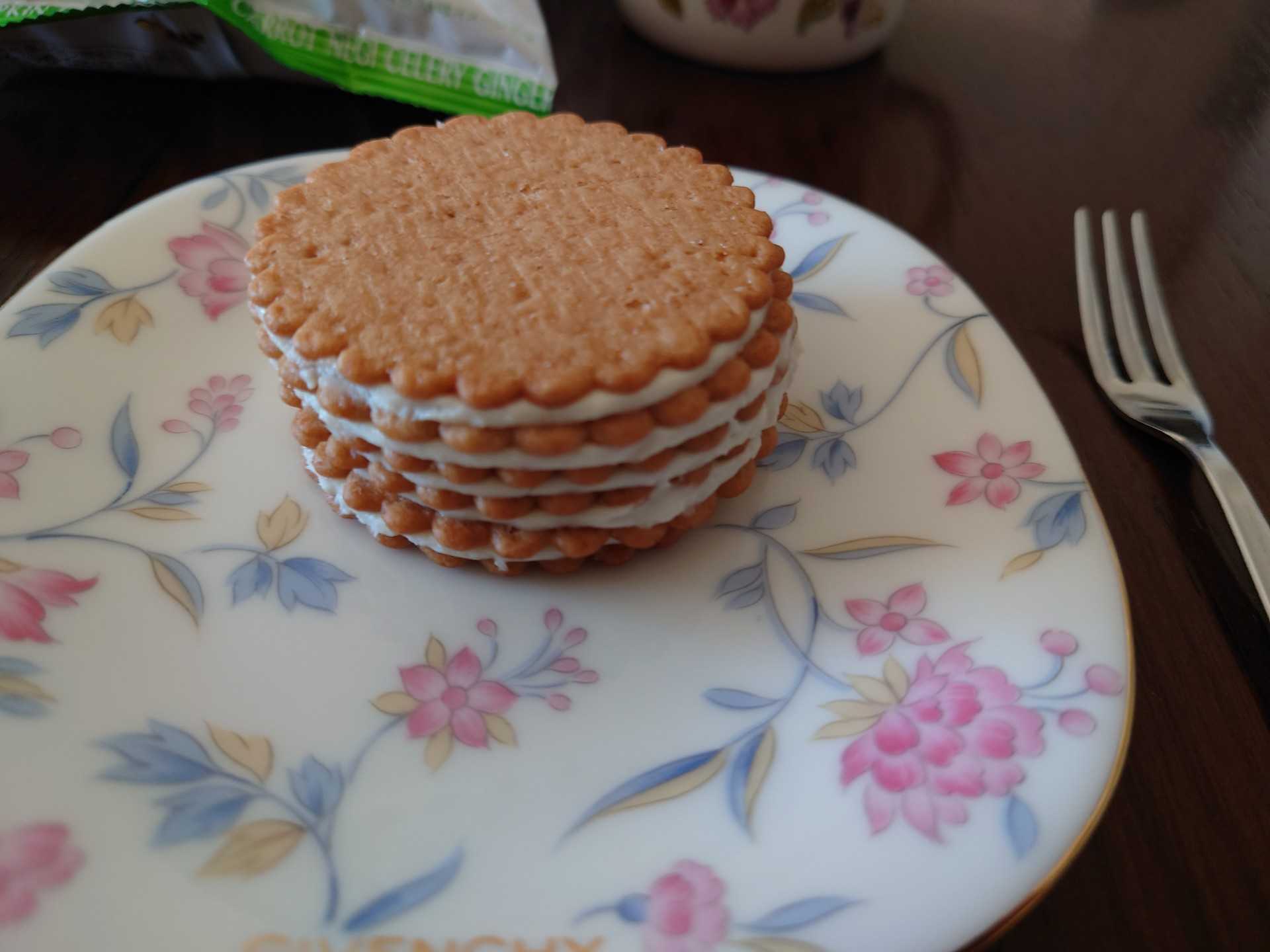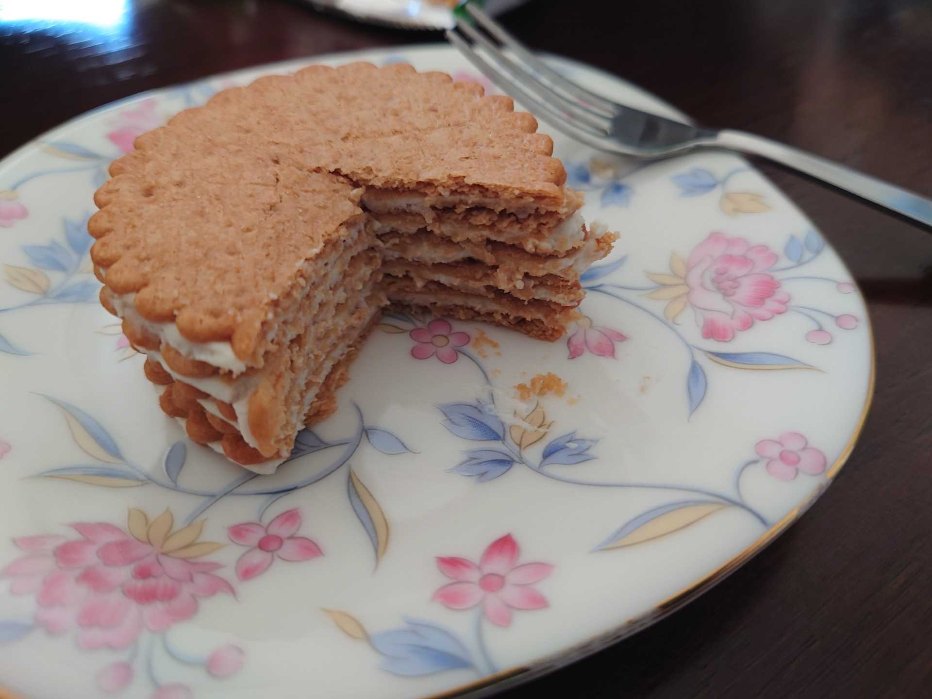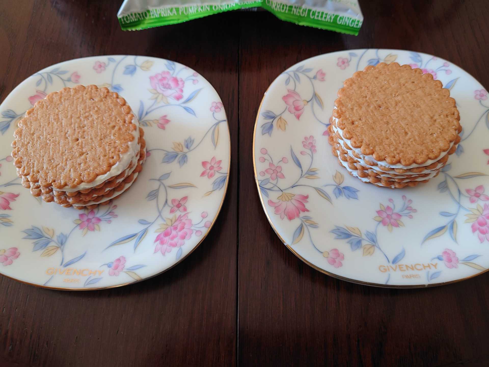 「ハーベスト」に自家製の「水切りヨーグルト」を挟んで作った「なんちゃってミルフィーユ」。