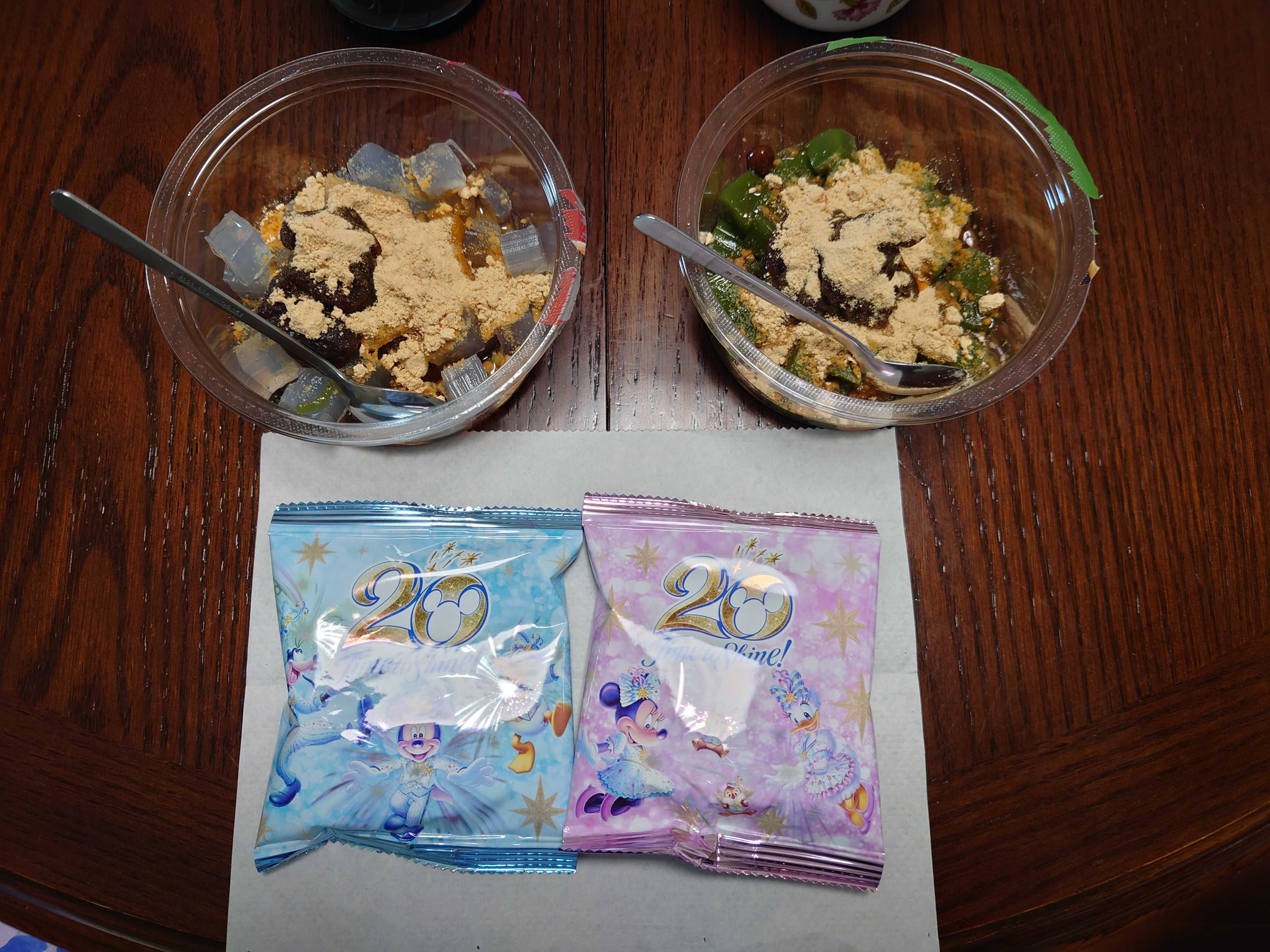 今日の午後のおやつは、「あんみつ」と「宇治抹茶寒天」とポテトチップスとインスタントコーヒー。