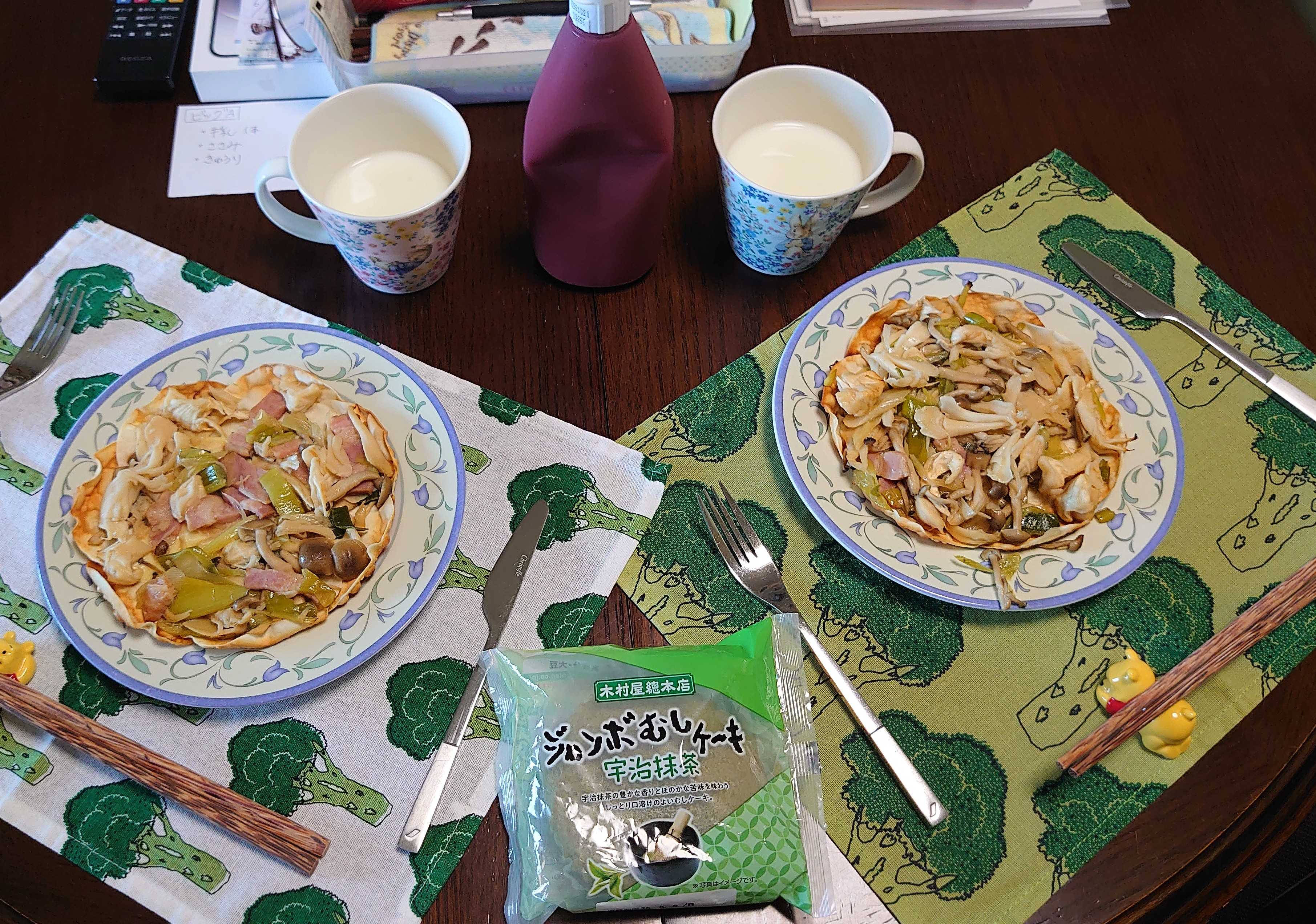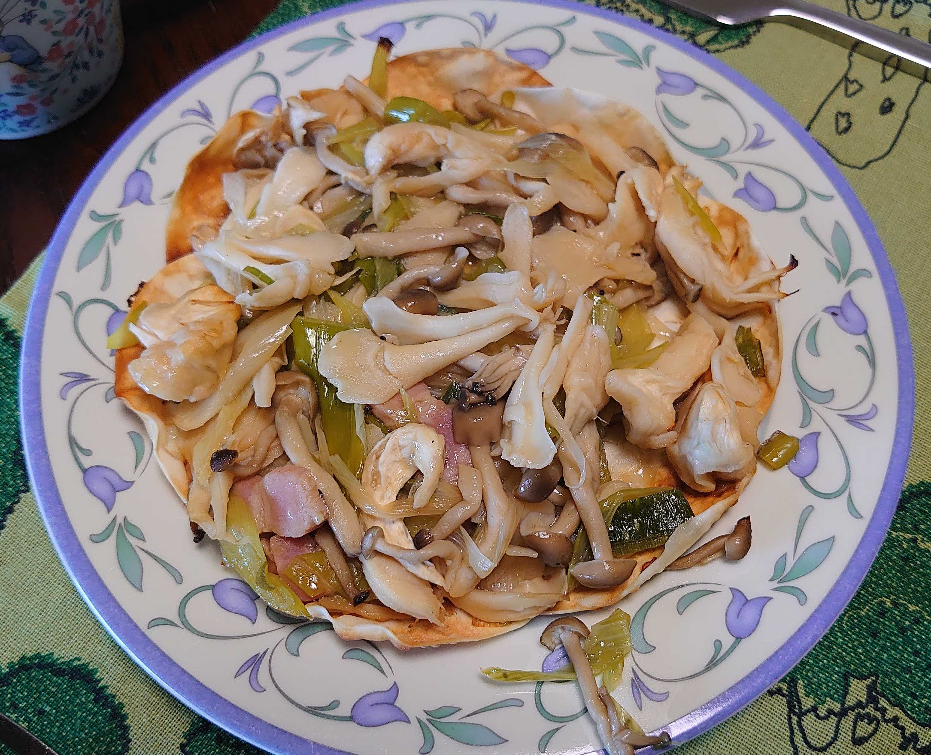 餃子の皮のピザ。具は、昨日の白まいたけ丼の具を使いました。