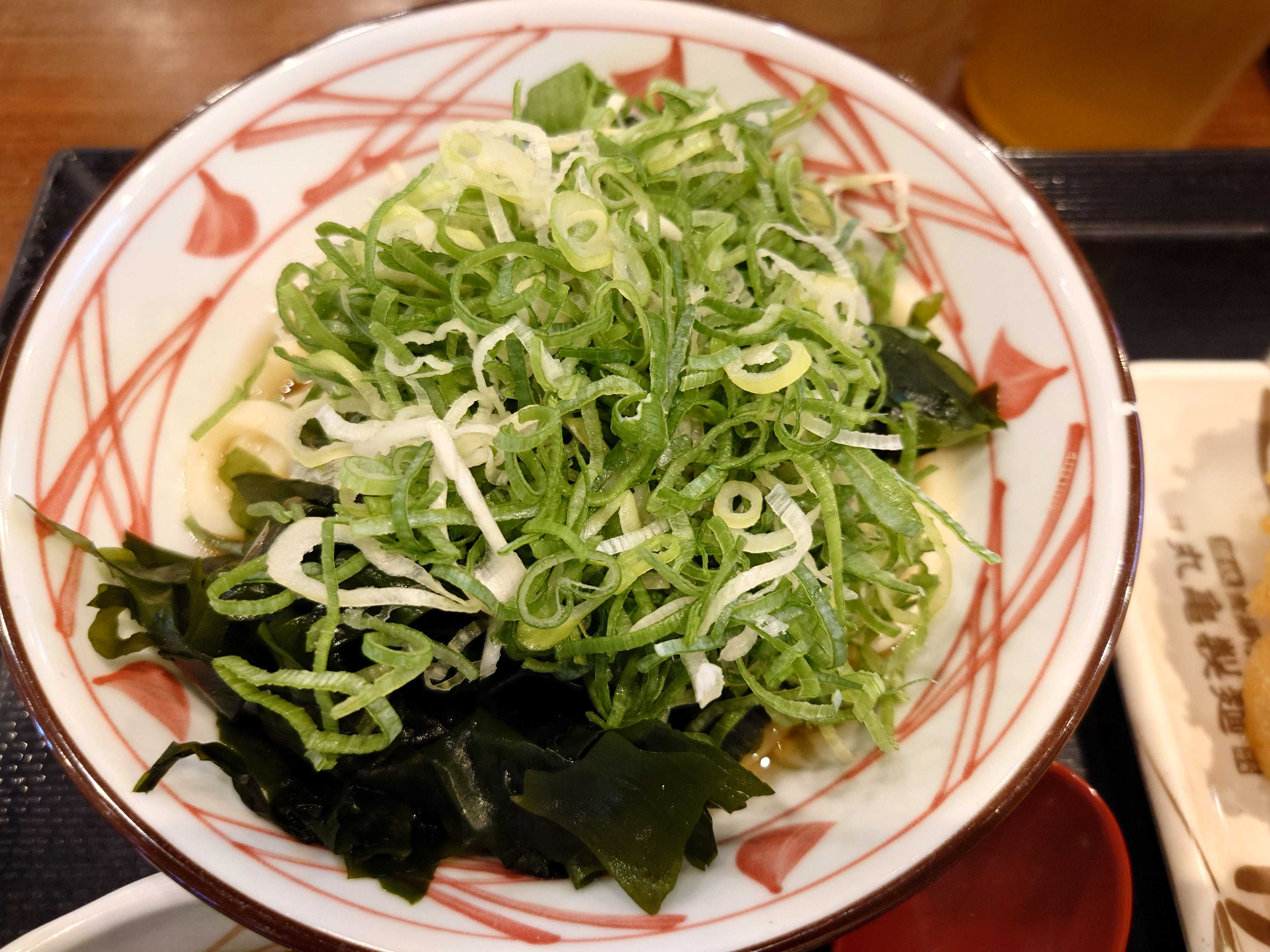 かけ(小)。無料のネギとわかめをたっぷりかけて。