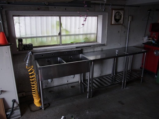 誰か。。。私を止めて。。。って事で!新たなプロジェクト発進です!しかし。。。ここまで来たら!どこまでも突き進んでやる!よっしゃ~~~って事で!先日いただいてきた業務用シンク!に、業務用調理台!そのままいただいてきたので。。。いろんな汚れが。。。ってことで、スクレーパー、リムーバー、クレンザー、金たわし。。。ごっくんの知っている知識フル動員で。。。ふぅ。。。3時間かけて終了!よっしゃ~~~(と、作業中の写真なし。。。)って事で!ででぇ~~~ん!んっ!ぴっかぴかだ!と!ここから旅は始まる!最近の日課は、ホームセンター通い。想像する世界を形に出来るモノを求めて!って。。。ホームセンター。。。結構好きなんですよねぇ。。。あんな事やこんな事。いろんな事を想像して。。。しかも!使い方のわからないものが沢山あるじゃないですか!使い方がわかったときの感動!便利な新製品を発見したときの感動!ん。。。たまりません。。。と、昨日もついつい買ってしまった物。。。って事で!ででぇ~~~ん!近所のホームセンターでは全ての部品がそろわない。。。ってより、数少なすぎない???足りないじゃん。。。こんな数で、ほとんどパーツ買い占め。。。もう少し在庫増やしてよ。。。と思いながら。。。在庫していた部品で作ったモノ!ってことで!ででぇ~~~ん!んっ!想像通り!って、部品一つ足りないけど。。。しかし、今回のプロジェクトで肝心なジョイント部分!ここから全てが始まります!しかし。。。先は長いなぁ。。。水・お湯・ガス!ん。。。「死なれたらたまらないし!換気扇付いてないと工事してあげないよぉ~~~」と、業者さんからも言われておりますが。。。近々現調に来てくれるようです!わからないことを教えてもらい、アイディアもらって!自分出来ることは自分でする!って。。。来てそのままチャチャッとやって行かれるようにも思うけど。。。私の楽しみを取られないように!プロの技を盗みたいと思います!と、まだまだ工事が続きます。冷蔵庫に、製氷器。電気工事は自分で出来るけど。。。されさて。。。車庫のレイアウトを早く決めなくっちゃ。。。って、まだ決まっておりません。。。(残念。。。)