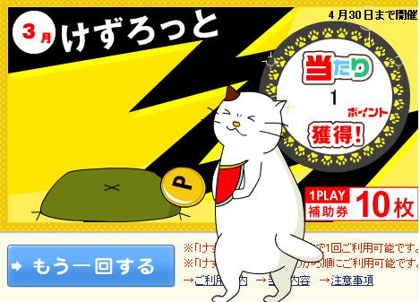 nfoseekくじ、久々にあたりました。1ポイントです。 BINGOは7個(真ん中を入れると8個)になりました。けずろっとの補助券は6枚になりました。今日も明日もいい日でありますように