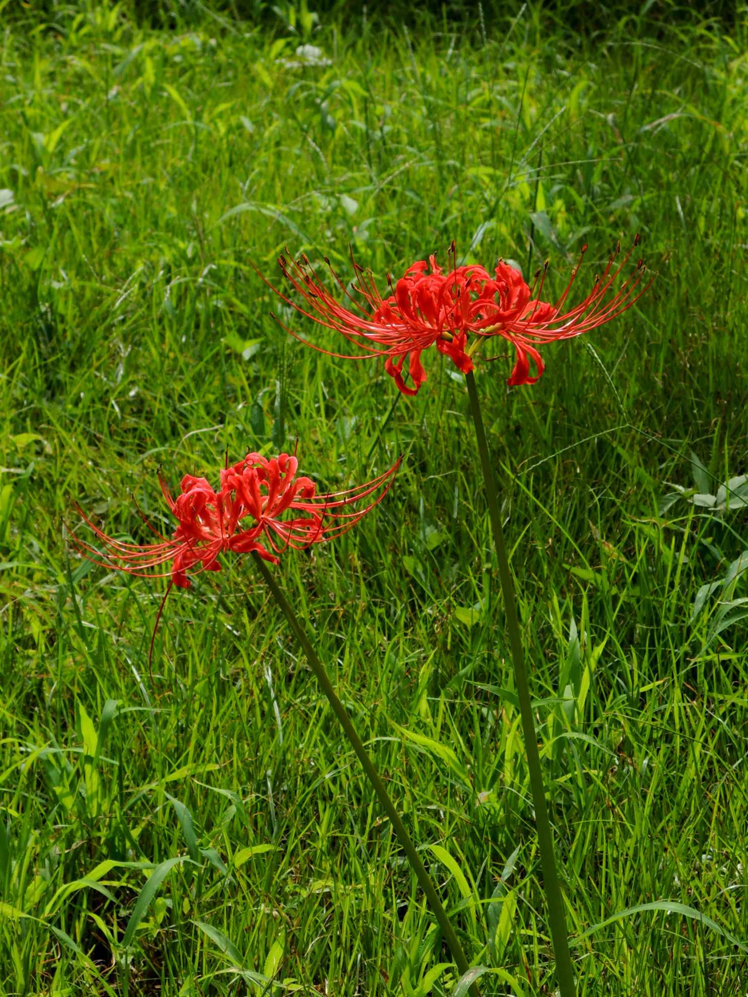 お墓参りに行ったら彼岸花が咲いてましたもう秋ですねー彼岸花というと怖いとか不気味とかいうイメージを持たれることが多いかと思いますなぜ怖いと思われがちなのでしょうか?・お墓に咲いてることが多い・秋分の日=お彼岸に咲く お彼岸はあの世の意味・普通あるはずの葉っぱがない・毒がありそううち毒があるのは本当で球根にリコリンという毒があるそうでも他の件についてはちゃんと理由があるんです◆ お墓に咲いてるのは遺体を土葬していた時代、モグラやネズミが遺体を荒らすことがありましたそこでモグラやネズミが嫌いな毒のある彼岸花を周囲に植えていたのです田んぼや畑の周りに生えているのもその為つまり怖いどころか守りの花だったのです!◆ 「彼岸」に咲くのは日照時間が短くなると花が咲くトリガーがONになる性質があるだけ秋分の日は昼と夜の長さが同じになるのでちょうどその頃に咲く訳です◆ 葉っぱがない?実はあるんですただタイミングがずれてるだけ花が枯れた後の晩秋(10月末頃)になると濃い緑色の細長い葉が生えてきて冬から春にかけて光合成を行い球根に栄養を蓄えます春の終わり頃には葉も枯れてしまうため花と葉が同時に見られないのですその姿があまりにも違うので雑草と間違えられることもあるほど実際私も軒先の彼岸花の葉を除去していました(^-^;彼岸花は見た目も生態も不思議な花ですが魔除けとされたり仏教では天上の花とされ尊ばれたりしました決して怖い存在ではないのですなお、ヒガンバナの英名はRed spider lily(レッドスパイダーリリー)なんかカッコいいですね!