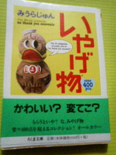 久しぶりのPC更新です~PCからだと絵文字が使えるし、写真もいっぱい載せれてイイネ今日は本を紹介しますみうらじゅんサンの『いやげ物』ですみうらじゅんさんの独特なセンスで集められた『いやげもの』ナイスですこの本の帯にはもらうといや?なみやげもの?と書いてあるケド、キャオ的には癒しのみやげものです逆さにすると水着ギャルがヌードになるボールペンキャオももってるョヌードトランプや椰子の実のおみやげ品 日本とハワイのおみやげ、どちらが勝っているか勝負。貝殻細工のおみやげ品をみうらじゅんさん的なおとぎ話にしたてあげていますこの貝殻系は似たようなのもってる、、、いろいろとカテゴリ別にわかれています。『二穴オヤジの世界』まぁざっと紹介しましたがマダマダ面白いものが盛りだくさんですキャオのブログではナカナカ面白さがわかりにくいかもしれませんが、、、、キャオ的に似たようなのけっこうもってたりしてウンウンとうなづける一冊でしたァオールカラー、160ページ、単行本 900円 オススメです
