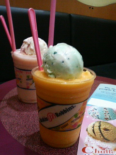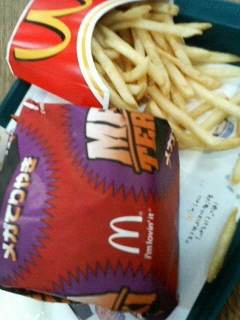 昨日、マックのハッピーセットを食べましたもちろんチーズバーガーで彼氏がシュレックのおもちゃが欲しいということだったので。2人してGET。紙コップもシュレックシュレックしゃべります『俺は怪物や~』とか『まかせとき』とかゲップの音の3パターンあったよ。浜ちゃんファンの人もいかがですかァ~そして割引チケットがあったのでマックフルーリーのキットカット入りのやつを食べました。オイシイんだけど量が多すぎました~。次はオレオ入りが発売したらお腹空いてるときに食べようサラダディッシュもおいしかった~ 写真撮り忘れた。チキンがやわらかくてオイシイビリーやってるけど食事はぜんぜん減らしてないから体重はあんまり変動ナシです