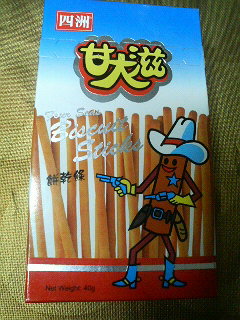 日本の製品じゃないプリッツ的なお菓子 日本語が書かれてないネ~ 絵かイイネ上部分 ビスケットスティックか ふーん~裏返して下部分を見てみると、、、、ビスケット と書いてあった ココにも日本語が。 一本とられたァ