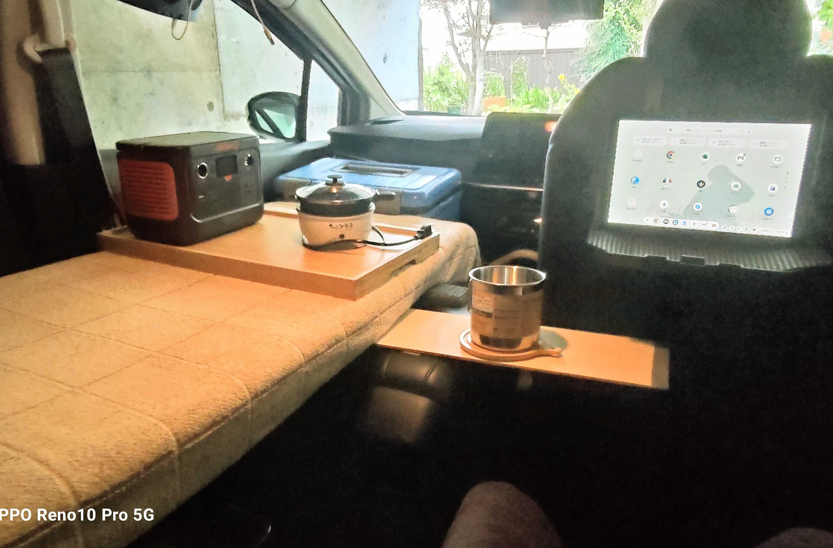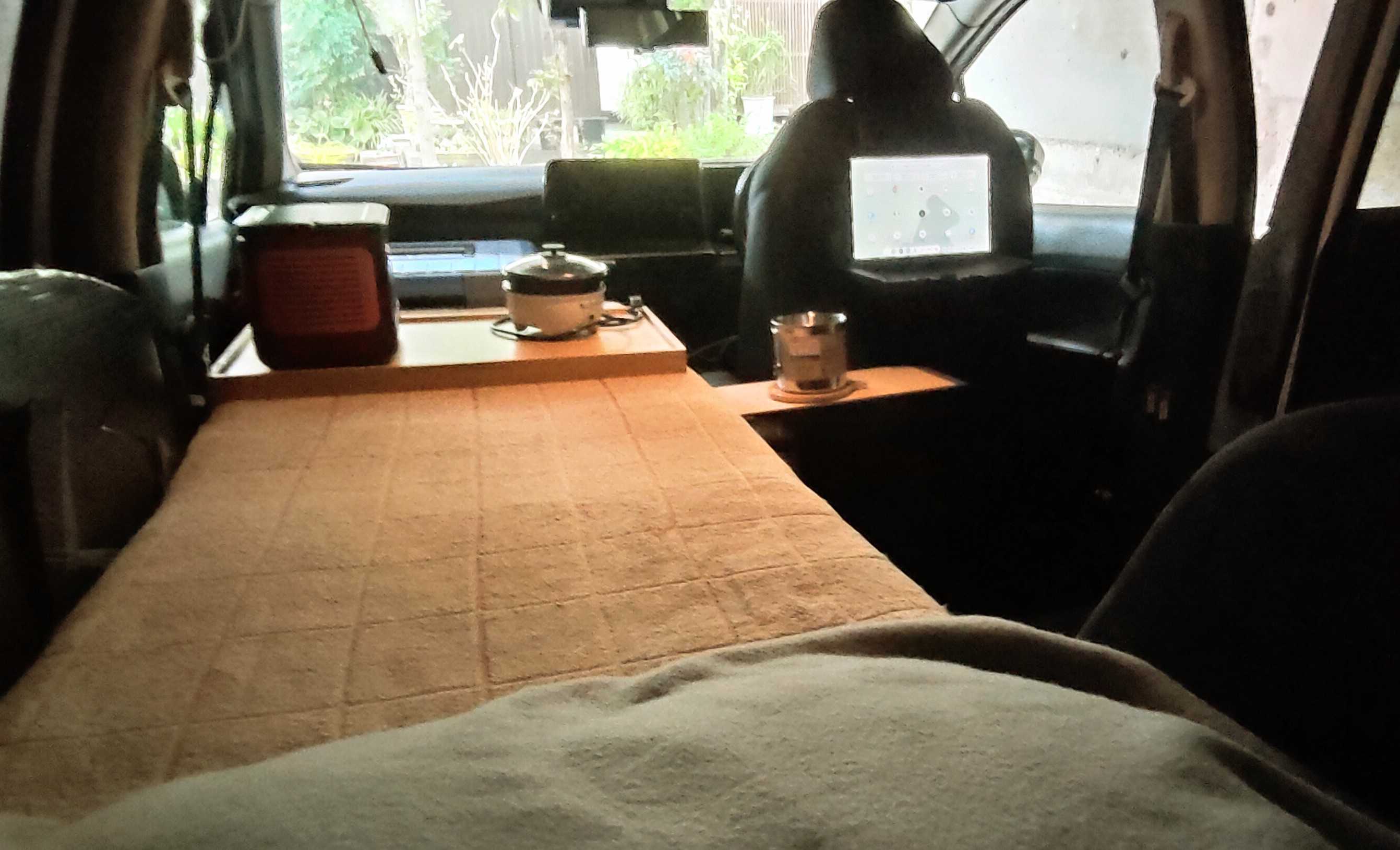 3、夜は運転席を知りたい方は前に倒し、その後部座席に座り、ベットをテーブル代わりにして、食事をテーブルしたり、タブレットで色々な動画を見たりしてくつろいでいます。