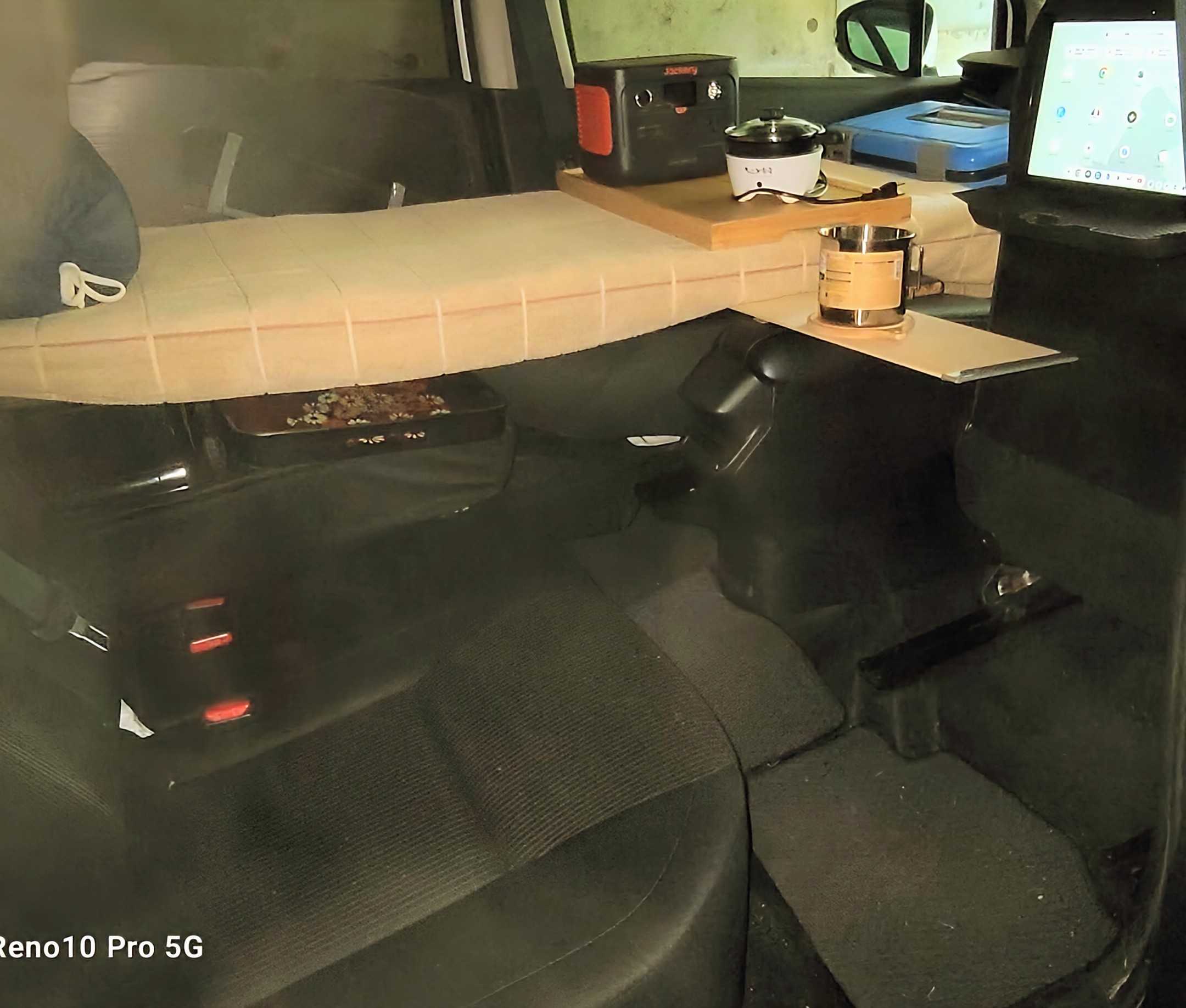 At night, I push the driver's seat forward snd sit in the rear seat behind it. I use the bed as a table to eat or relax and watch videos on my tablet.