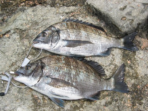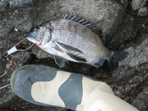 一昨日夜9時過ぎ自宅出発・磯についたのが0時半頃到着し仮眠を取り3時半頃歩いて5分の釣リ場へ向かう。月も出ていたが四時ともなれば夜も開け明るくなっていました。少し風があり波も立っている中仕掛けをセットし釣り開始!釣り始めてから2時間くらいしてから根掛りかと思うような感触で竿を引くと・なにやら魚の感触が・・引きが強かったがクロダイとは思わず竿を立て、リールを巻くと目の前でヒラを打つクロダイが確認でき後はタモで上げて・・一人で喜んでおりました。しばらくしてからまた浮きがゆらゆらと沈み・・竿を立てると強い引きがあり・・・また来たと思いました。魚体もよくまたサイズアップも出来ました。ラッキーな一日でした。