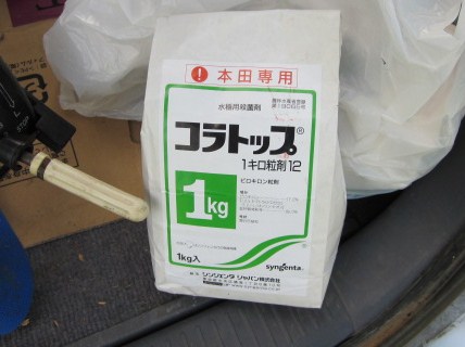 雨が降ってようやく田んぼの水が適度な量になり薬を撒いてきました。こんな殺菌剤を撒きました。こんな機械を使って散布しました。