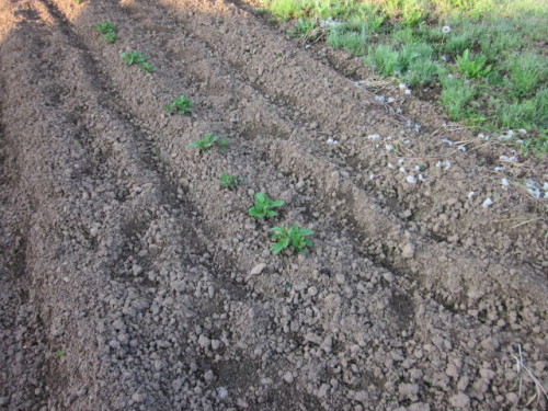 え~と、いつだったかなぁ?ジャガイモを植えたのは。この間、畑を見たらジャガイモのはっぱ出ていました。