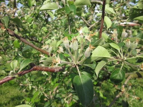 とりあえず田植えと手直しが終わり今度はリンゴの手入れです。おととしの高温の影響で昨年もリンゴは不作でしたが、今年は沢山の花が咲き、沢山の実が成っています。沢山実がなるのはうれしいが、手入れが大変です。余計な分を適度な間隔で摘果しなくてはいけません。今日、その作業をしましたが・・あまりの成り方で作業が大変です。明日も頑張ります。